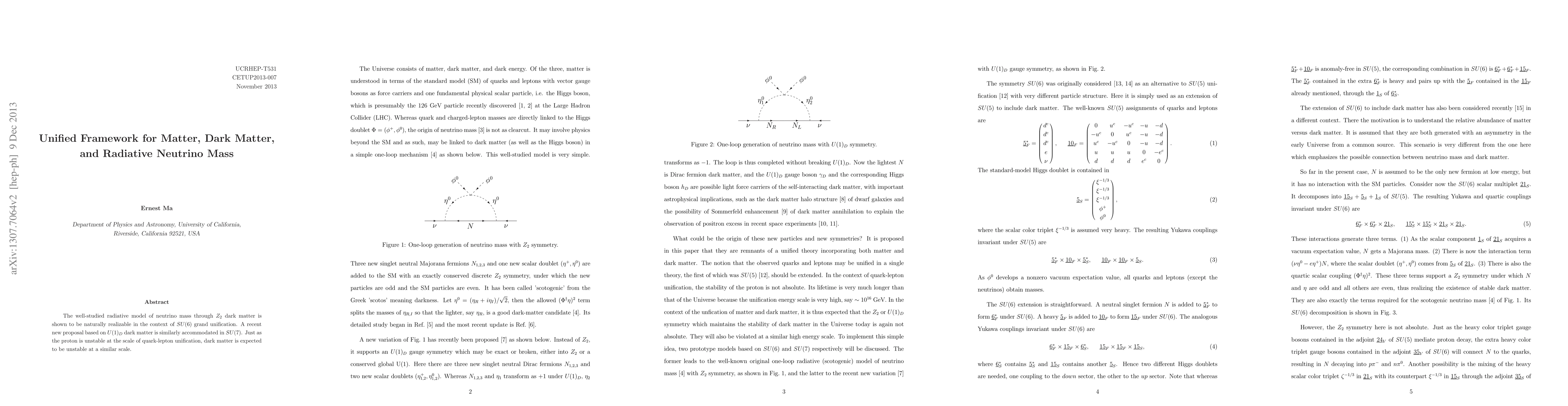 The well-studied radiative model of neutrino mass through $Z_2$ dark matter is shown to be naturally realizable in the context of SU(6) grand unification. A recent new proposal based on U(1)_D dark matter is similarly accommodated in SU(7). Just as the proton is unstable at the scale of quark-lepton unification, dark matter is expected to be unstable at a similar scale.