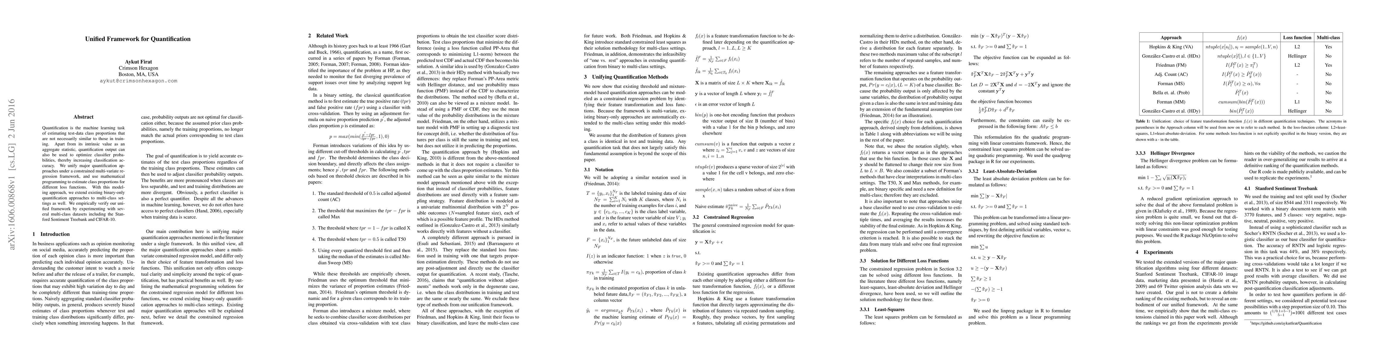 Quantification is the machine learning task of estimating test-data class proportions that are not necessarily similar to those in training. Apart from its intrinsic value as an aggregate statistic, quantification output can also be used to optimize classifier probabilities, thereby increasing classification accuracy. We unify major quantification approaches under a constrained multi-variate regression framework, and use mathematical programming to estimate class proportions for different loss functions. With this modeling approach, we extend existing binary-only quantification approaches to multi-class settings as well. We empirically verify our unified framework by experimenting with several multi-class datasets including the Stanford Sentiment Treebank and CIFAR-10.