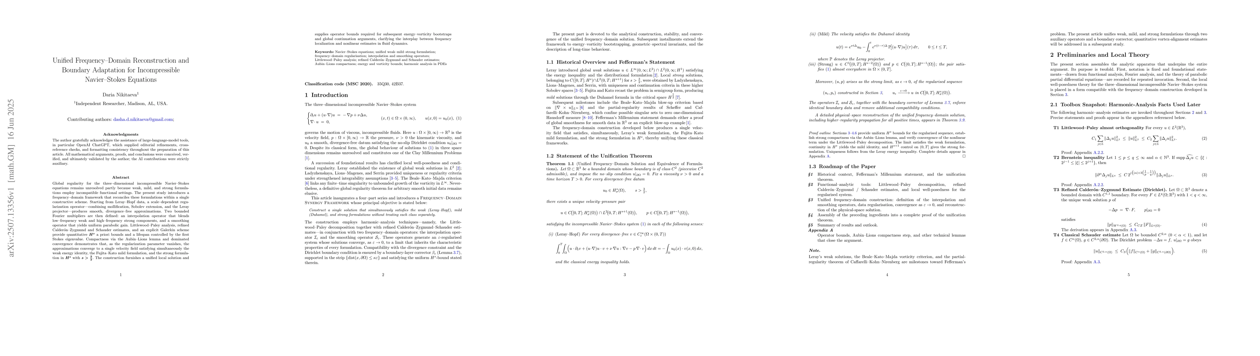 Global regularity for the three-dimensional incompressible Navier-Stokes equations remains unresolved partly because weak, mild, and strong formulations employ incompatible functional settings. The present study introduces a frequency-domain framework that reconciles these formulations within a single constructive scheme. Starting from Leray-Hopf data, a scale-dependent regularization operator combining mollification, Sobolev extension, and the Leray projector produces smooth, divergence-free approximations. Two bounded Fourier multipliers are then defined: an interpolation operator that blends low-frequency weak and high-frequency strong components, and a smoothing operator that yields uniform parabolic gain. Littlewood-Paley analysis, refined Calderon-Zygmund and Schauder estimates, and an explicit Galerkin scheme provide quantitative Hs a priori bounds and a lifespan controlled by the first Stokes eigenvalue. Compactness via the Aubin-Lions lemma and dominated convergence demonstrates that, as the regularization parameter vanishes, the approximations converge to a single velocity field satisfying simultaneously the weak energy identity, the Fujita-Kato mild formulation, and the strong formulation in Hs with s > 3/2. The construction furnishes a unified local solution and supplies operator bounds required for subsequent energy-vorticity bootstraps and global continuation arguments, clarifying the interplay between frequency localization and nonlinear estimates in fluid dynamics.