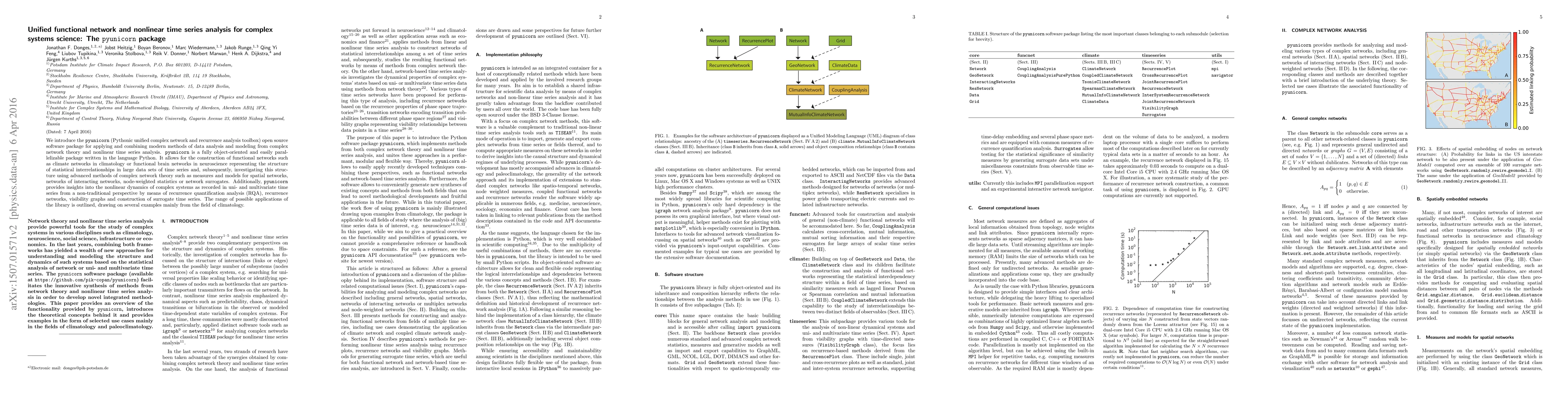 The \texttt{pyunicorn} package offers tools for complex network and nonlinear time series analysis, combining modern data analysis methods for large time series datasets. It facilitates the construction of functional networks and provides advanced tools for investigating their structure and dynamics.