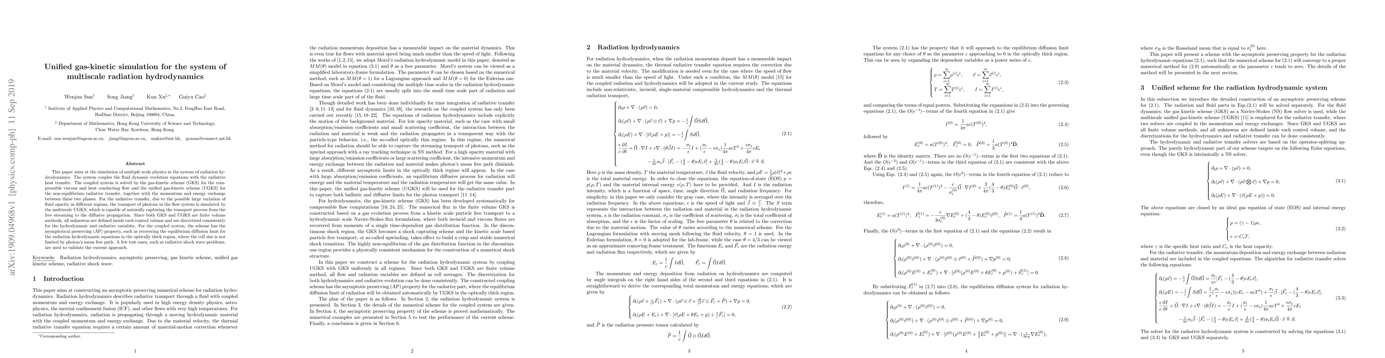 This paper presents a unified gas-kinetic simulation method combining GKS and UGKS to solve multiscale radiation hydrodynamics, capturing both fluid dynamics and radiative heat transfer with an asymptotic preserving property. Validation through radiative shock wave problems demonstrates the method's effectiveness.