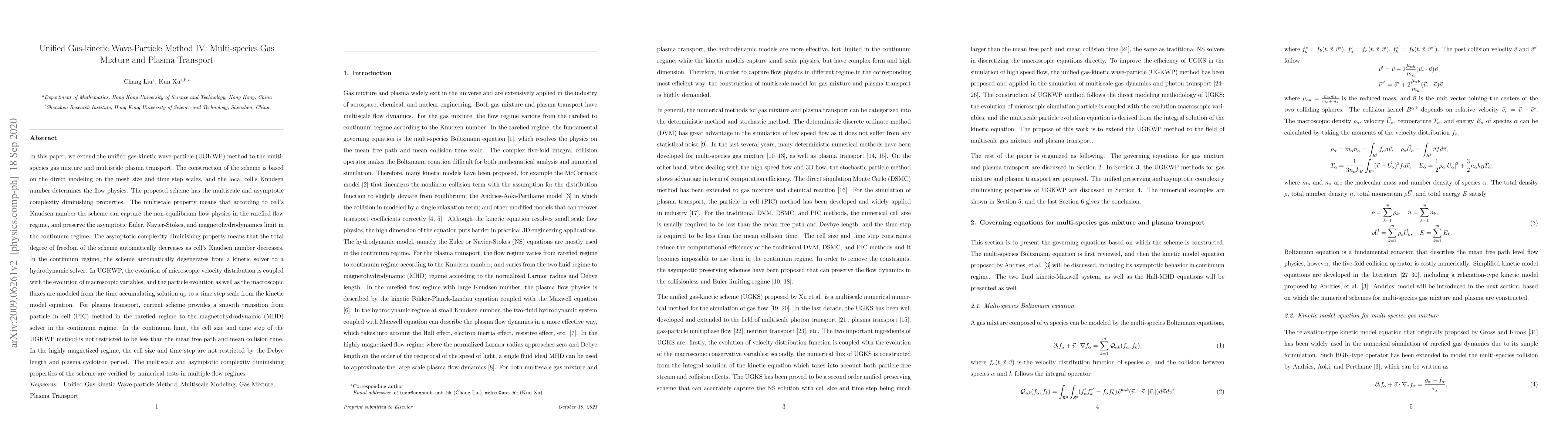 This paper extends the unified gas-kinetic wave-particle (UGKWP) method to multi-species gas mixtures and plasma transport, demonstrating its ability to capture non-equilibrium flow physics in rarefied regimes and transition seamlessly to hydrodynamic solvers in continuum regimes. The method's efficiency is validated through numerical tests across various flow conditions.