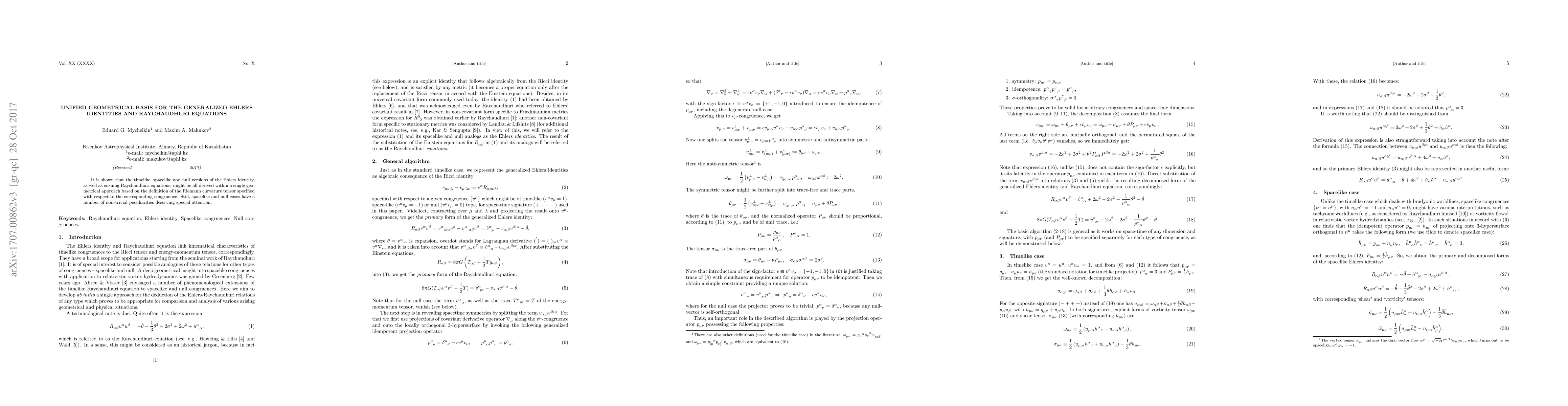 Research shows that the generalized Ehlers identities and Raychaudhuri equations can be derived from a single geometrical approach based on the Riemann curvature tensor, with some peculiarities noted in spacelike and null cases.