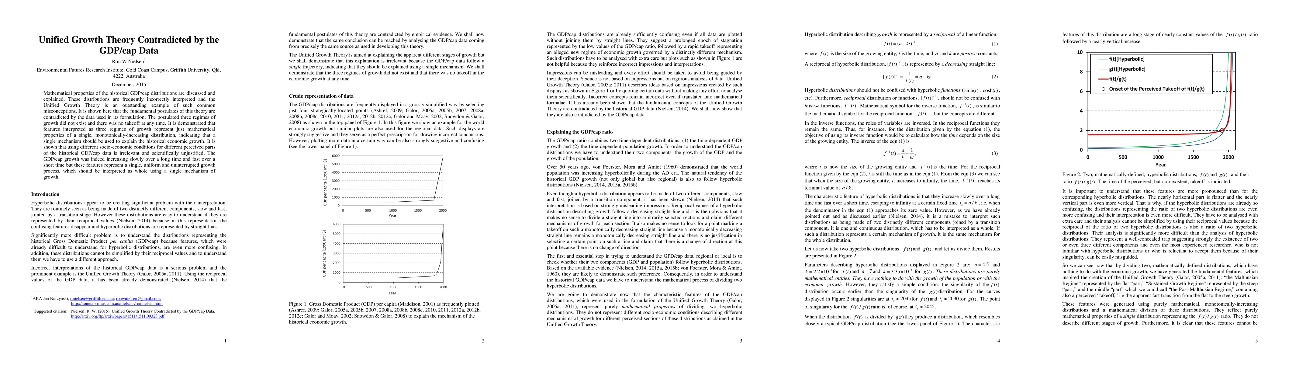Mathematical properties of the historical GDP/cap distributions are discussed and explained. These distributions are frequently incorrectly interpreted and the Unified Growth Theory is an outstanding example of such common misconceptions. It is shown here that the fundamental postulates of this theory are contradicted by the data used in its formulation. The postulated three regimes of growth did not exist and there was no takeoff at any time. It is demonstrated that features interpreted as three regimes of growth represent just mathematical properties of a single, monotonically-increasing distribution, indicating that a single mechanism should be used to explain the historical economic growth. It is shown that using different socio-economic conditions for different perceived parts of the historical GDP/cap data is irrelevant and scientifically unjustified. The GDP/cap growth was indeed increasing slowly over a long time and fast over a short time but these features represent a single, uniform and uninterrupted growth process, which should be interpreted as whole using a single mechanism of growth.