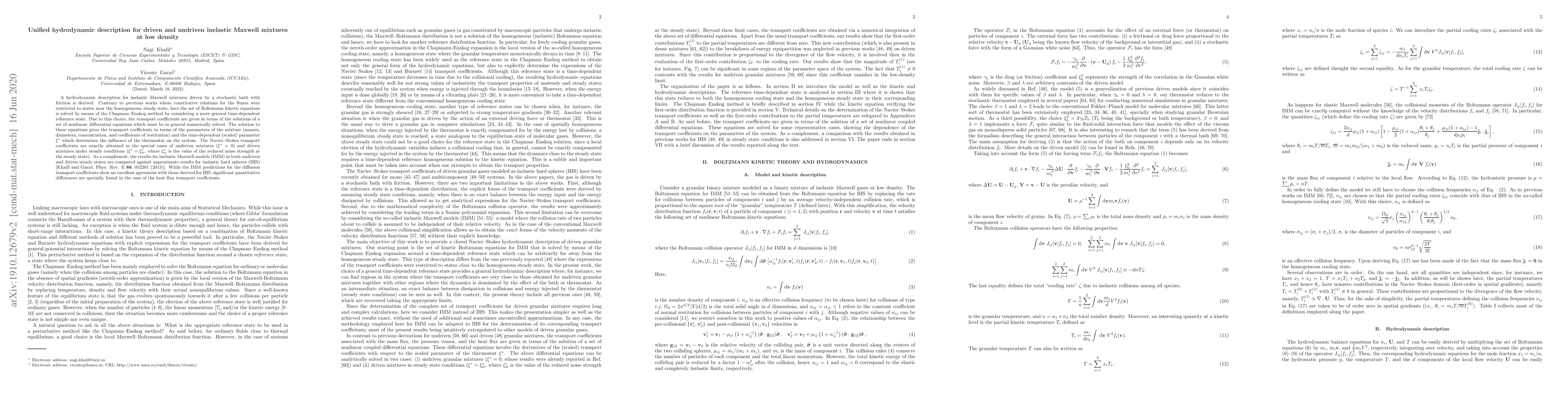This paper derives a unified hydrodynamic description for driven and undriven inelastic Maxwell mixtures at low density, solving Boltzmann kinetic equations using the Chapman-Enskog method for a general time-dependent reference state. The transport coefficients are obtained through nonlinear differential equations, showing exact Navier-Stokes results for undriven and steady-driven mixtures.