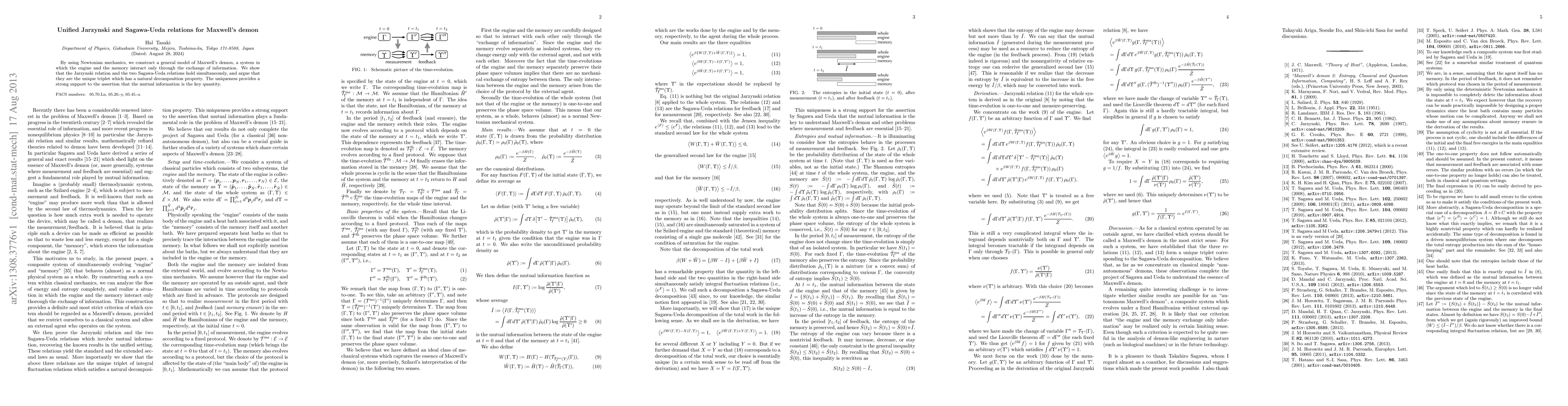 By using Newtonian mechanics, we construct a general model of Maxwell's demon, a system in which the engine and the memory interact only through the exchange of information. We show that the Jarzynski relation and the two Sagawa-Ueda relations hold simultaneously, and argue that they are the unique triplet which has a natural decomposition property. The uniqueness provides a strong support to the assertion that the mutual information is the key quantity.
