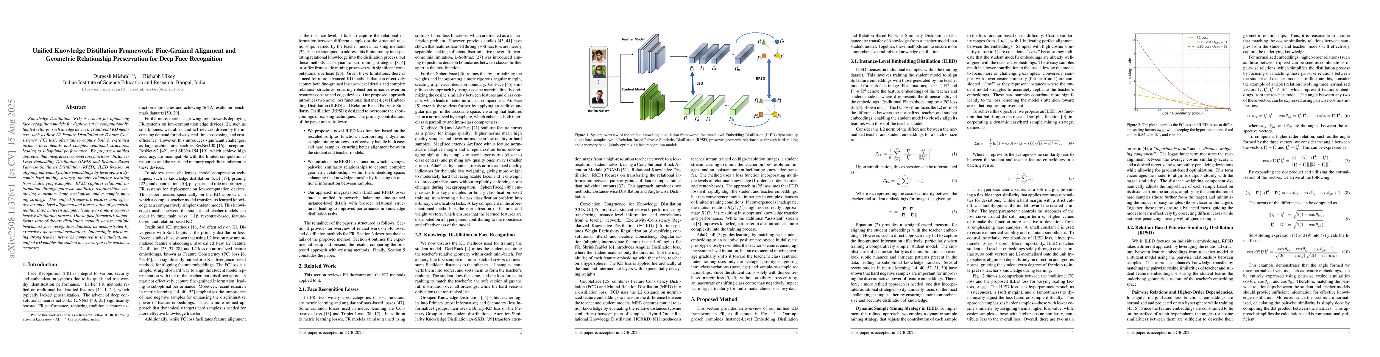 Knowledge Distillation is crucial for optimizing face recognition models for deployment in computationally limited settings, such as edge devices. Traditional KD methods, such as Raw L2 Feature Distillation or Feature Consistency loss, often fail to capture both fine-grained instance-level details and complex relational structures, leading to suboptimal performance. We propose a unified approach that integrates two novel loss functions, Instance-Level Embedding Distillation and Relation-Based Pairwise Similarity Distillation. Instance-Level Embedding Distillation focuses on aligning individual feature embeddings by leveraging a dynamic hard mining strategy, thereby enhancing learning from challenging examples. Relation-Based Pairwise Similarity Distillation captures relational information through pairwise similarity relationships, employing a memory bank mechanism and a sample mining strategy. This unified framework ensures both effective instance-level alignment and preservation of geometric relationships between samples, leading to a more comprehensive distillation process. Our unified framework outperforms state-of-the-art distillation methods across multiple benchmark face recognition datasets, as demonstrated by extensive experimental evaluations. Interestingly, when using strong teacher networks compared to the student, our unified KD enables the student to even surpass the teacher's accuracy.