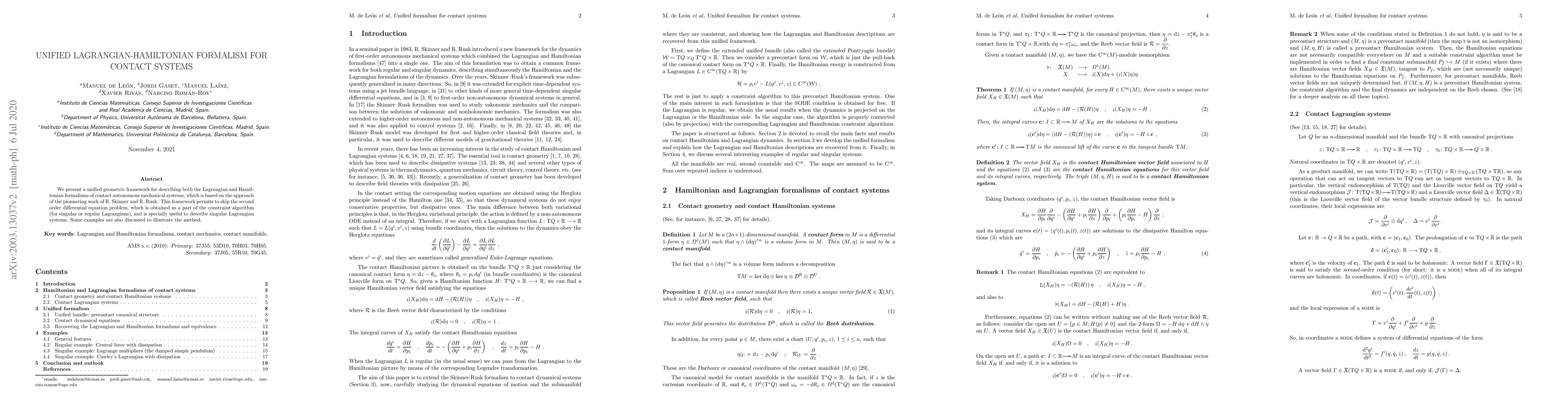 This paper introduces a unified geometric framework that combines Lagrangian and Hamiltonian approaches for contact autonomous mechanical systems, avoiding second-order differential equations typically encountered in constraint algorithms, particularly useful for singular Lagrangian systems. Examples are provided to demonstrate the method.