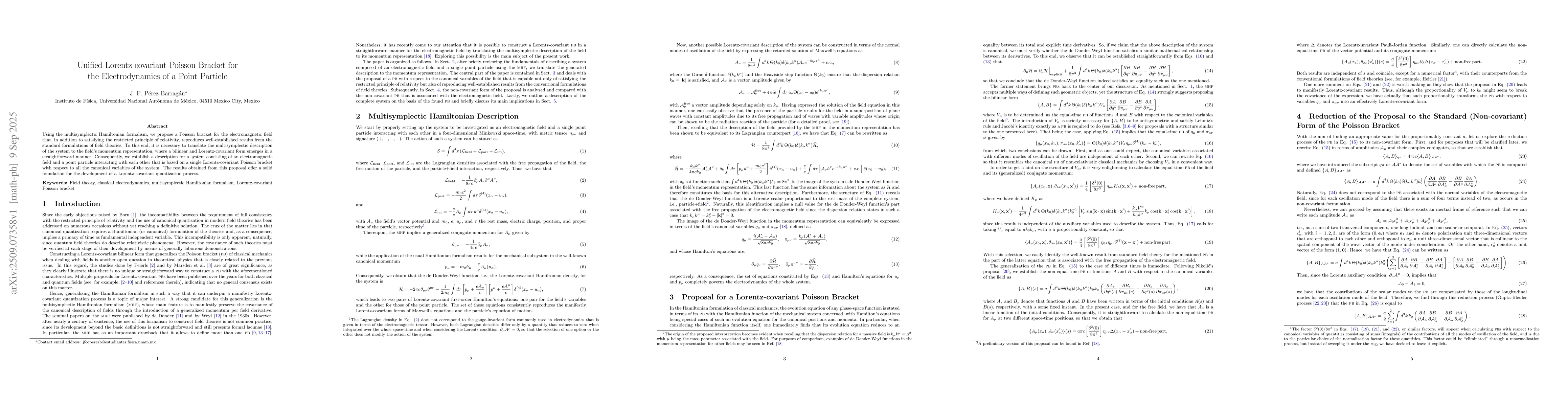 Using the multisymplectic Hamiltonian formalism, we propose a Poisson bracket for the electromagnetic field that, in addition to satisfying the restricted principle of relativity, reproduces well-established results from the standard formulations of field theories. To this end, it is necessary to translate the multisymplectic description of the system to the field's momentum representation, where a bilinear and Lorentz-covariant form emerges in a straightforward manner. Consequently, we establish a description for a system consisting of an electromagnetic field and a point particle interacting with each other that is based on a single Lorentz-covariant Poisson bracket with respect to all the canonical variables of the system. The results obtained from this proposal offer a solid foundation for the development of a Lorentz-covariant quantization process.