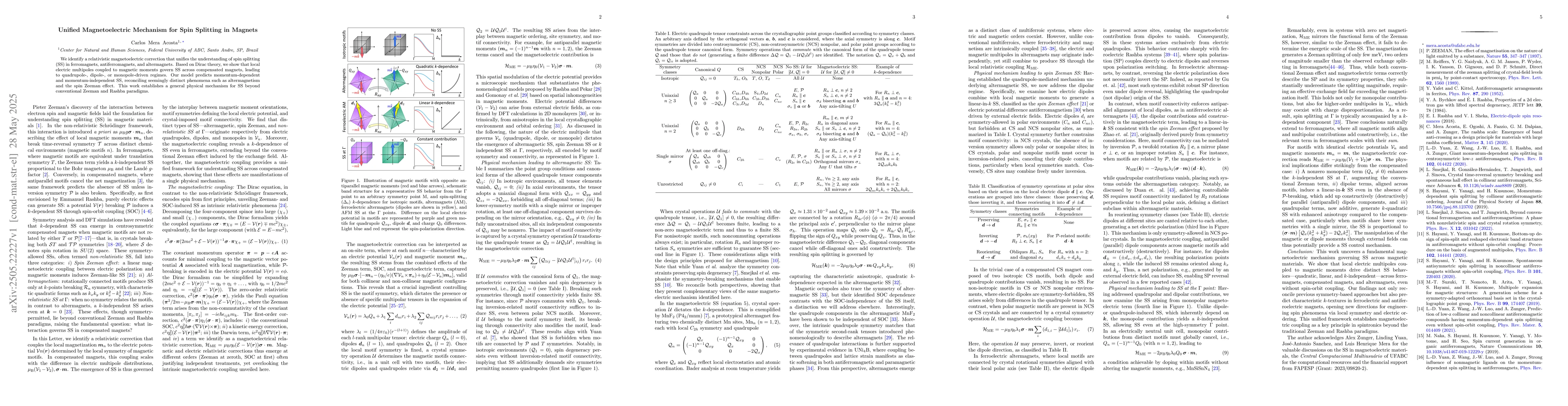 The introduction of a relativistic magnetoelectric correction to explain spin splitting in multiple magnetic systems, providing a coherent framework for understanding SS in compensated magnets.