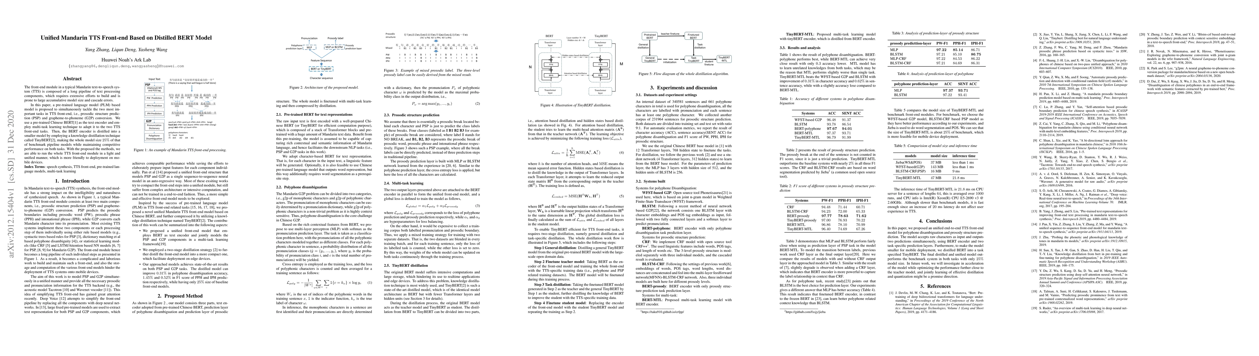 This paper proposes a unified Mandarin TTS front-end model based on a distilled BERT model, combining prosodic structure prediction and grapheme-to-phoneme conversion into a single, smaller, and more efficient system, achieving 25% reduction in model size while maintaining performance.