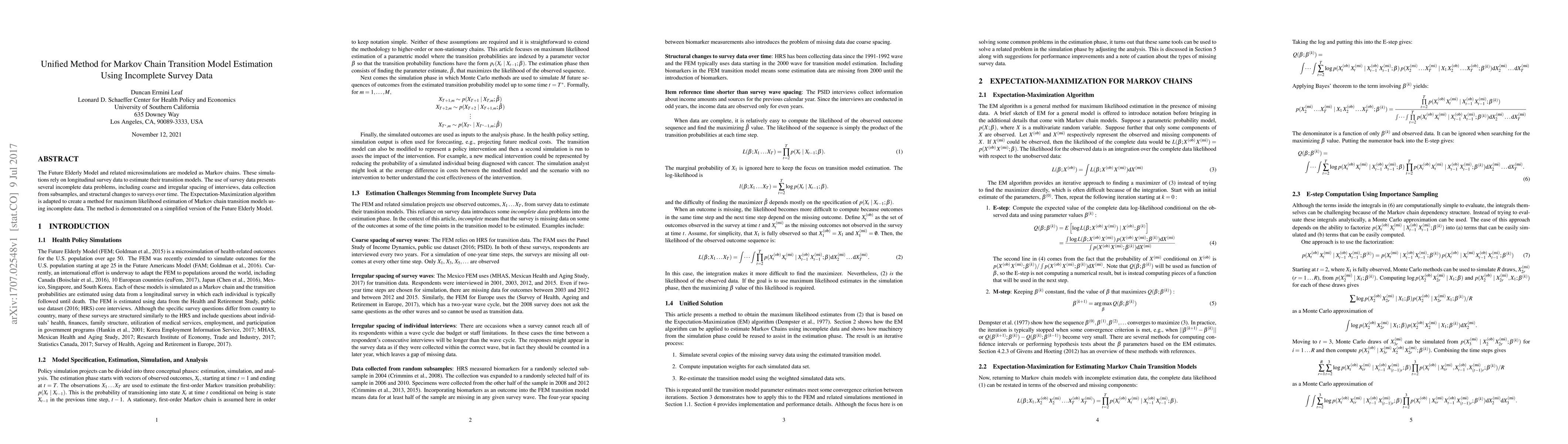 The Future Elderly Model and related microsimulations are modeled as Markov chains. These simulations rely on longitudinal survey data to estimate their transition models. The use of survey data presents several incomplete data problems, including coarse and irregular spacing of interviews, data collection from subsamples, and structural changes to surveys over time. The Expectation-Maximization algorithm is adapted to create a method for maximum likelihood estimation of Markov chain transition models using incomplete data. The method is demonstrated on a simplified version of the Future Elderly Model.