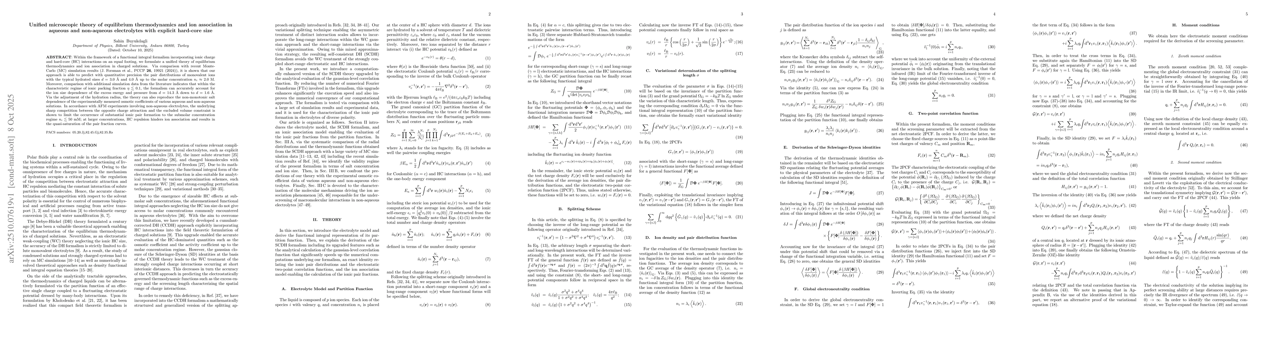 Within the framework of a functional integral formalism incorporating ionic charge and hard-core (HC) interactions on an equal footing, we formulate a unified theory of equilibrium thermodynamics and ion association in charged solutions. Via comparison with recent Monte-Carlo (MC) simulation results (J. Forsman et al., PCCP 26, 19921 (2024)), it is shown that our approach is able to predict with quantitative precision the pair distributions of monovalent ions with the typical hydrated sizes d = 3.0 A and 4.0 A up to the molar concentration ni = 2.0 M. Moreover, comparison with additional simulation data from the literature indicates that within the characteristic regime of ionic packing fraction eta <0.1, the formalism can accurately account for the ion size dependence of the excess energy and pressure from d = 14.3 A down to d = 1.6 A. Via the adjustment of the hydration radius, the theory can also reproduce the non-monotonic salt dependence of the experimentally measured osmotic coefficients of various aqueous and non-aqueous solutions. In accordance with AFM experiments involving non-aqueous electrolytes, the underlying sharp competition between the opposite charge attraction and the excluded volume constraint is shown to limit the occurrence of substantial ionic pair formation to the submolar concentration regime ni <50 mM; at larger concentrations, HC repulsion hinders ion association and results in the quasi-saturation of the pair fraction curves.