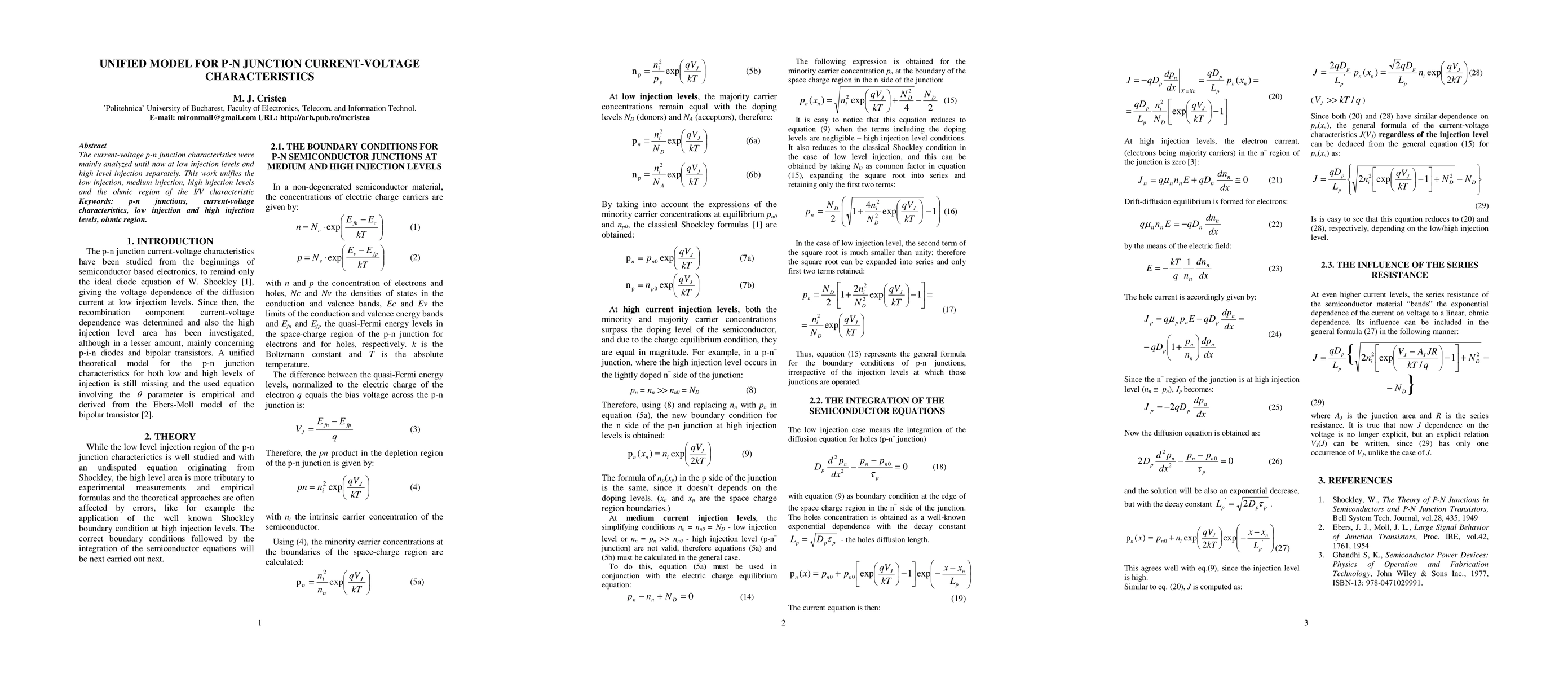 The current-voltage p-n junction characteristics were mainly analyzed until now at low injection levels and high level injection separately. This work unifies the low injection, medium injection, high injection levels and the ohmic region of the I/V characteristics. Keywords: p-n junctions, current-voltage characteristics, low injection and high injection levels, ohmic region.