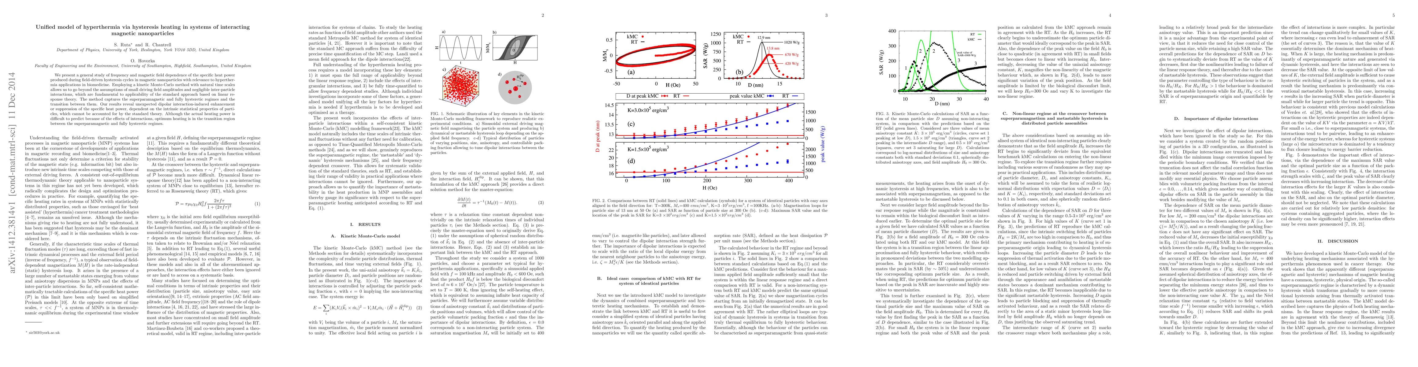 We present a general study of frequency and magnetic field dependence of the specific heat power produced during field-driven hysteresis cycles in magnetic nanoparticles with relevance to hyperthermia applications in biomedicine. Employing a kinetic Monte-Carlo method with natural time scales allows us to go beyond the assumptions of small driving field amplitudes and negligible inter-particle interactions, which are fundamental to applicability of the standard approach based on linear response theory. The method captures the superparamagnetic and fully hysteretic regimes and the transition between them. Our results reveal unexpected dipolar interaction-induced enhancement or suppression of the specific heat power, dependent on the intrinsic statistical properties of particles, which cannot be accounted for by the standard theory. Although the actual heating power is difficult to predict because of the effects of interactions, optimum heating is in the transition region between the superparamagnetic and fully hysteretic regimes.