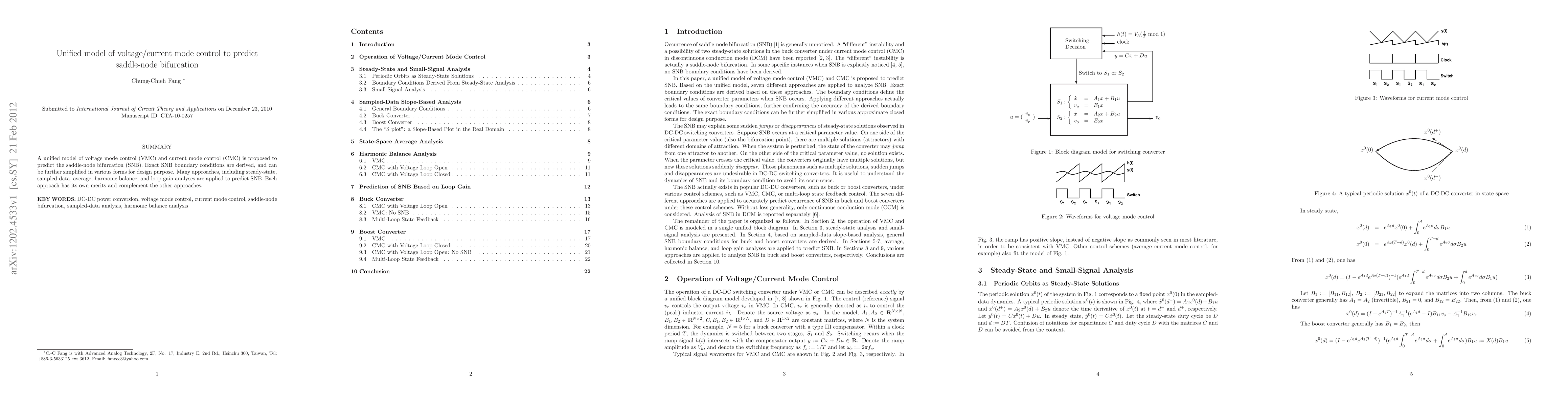 A unified model of voltage mode control (VMC) and current mode control (CMC) is proposed to predict the saddle-node bifurcation (SNB). Exact SNB boundary conditions are derived, and can be further simplified in various forms for design purpose. Many approaches, including steady-state, sampled-data, average, harmonic balance, and loop gain analyses are applied to predict SNB. Each approach has its own merits and complement the other approaches.