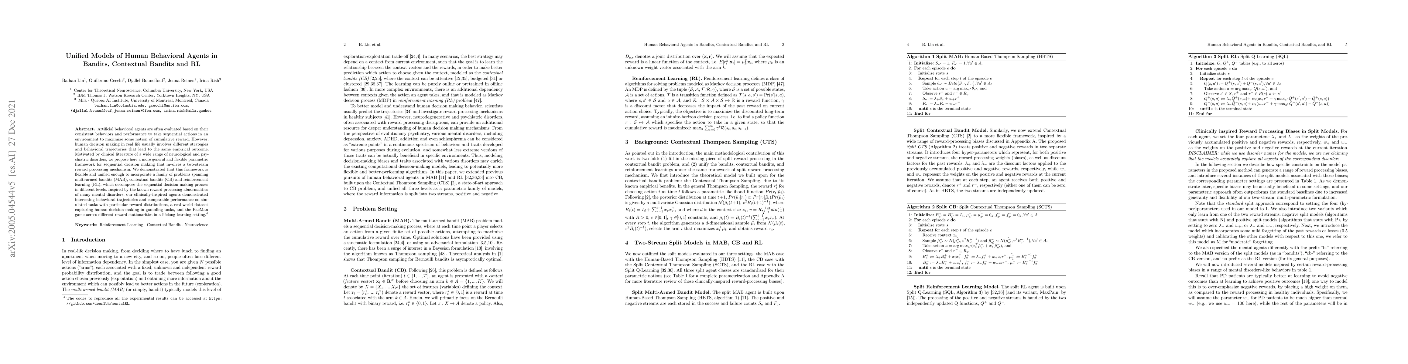 Artificial behavioral agents are often evaluated based on their consistent behaviors and performance to take sequential actions in an environment to maximize some notion of cumulative reward. However, human decision making in real life usually involves different strategies and behavioral trajectories that lead to the same empirical outcome. Motivated by clinical literature of a wide range of neurological and psychiatric disorders, we propose here a more general and flexible parametric framework for sequential decision making that involves a two-stream reward processing mechanism. We demonstrated that this framework is flexible and unified enough to incorporate a family of problems spanning multi-armed bandits (MAB), contextual bandits (CB) and reinforcement learning (RL), which decompose the sequential decision making process in different levels. Inspired by the known reward processing abnormalities of many mental disorders, our clinically-inspired agents demonstrated interesting behavioral trajectories and comparable performance on simulated tasks with particular reward distributions, a real-world dataset capturing human decision-making in gambling tasks, and the PacMan game across different reward stationarities in a lifelong learning setting.