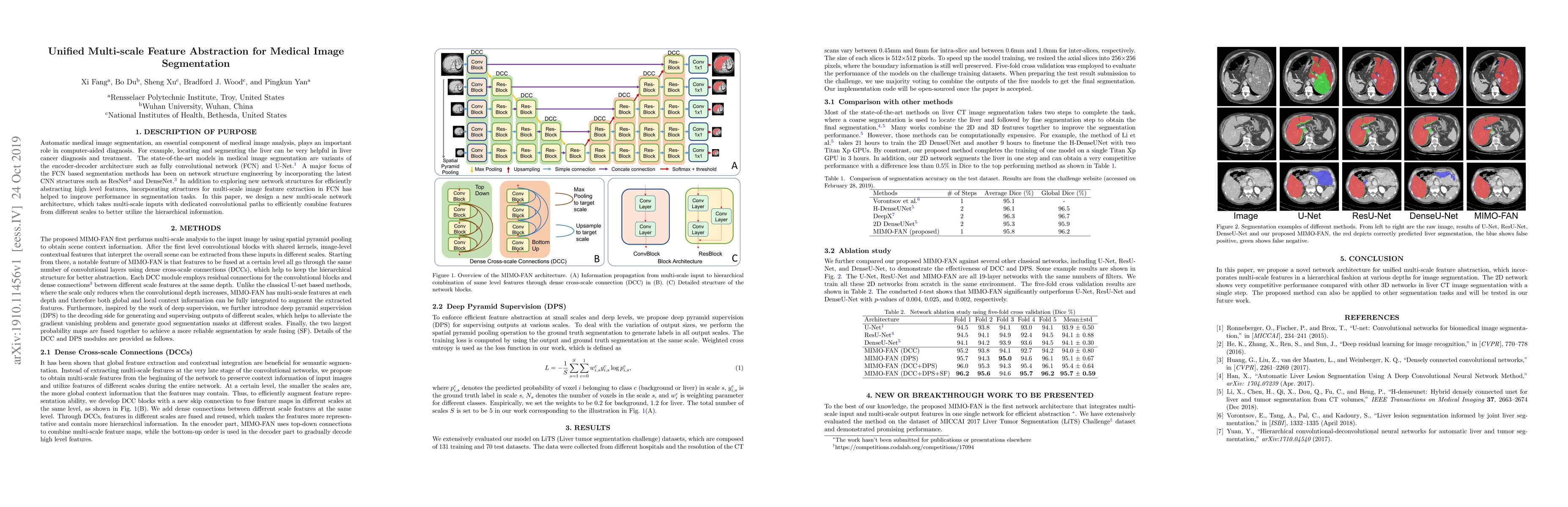 Automatic medical image segmentation, an essential component of medical image analysis, plays an importantrole in computer-aided diagnosis. For example, locating and segmenting the liver can be very helpful in livercancer diagnosis and treatment. The state-of-the-art models in medical image segmentation are variants ofthe encoder-decoder architecture such as fully convolutional network (FCN) and U-Net.1A major focus ofthe FCN based segmentation methods has been on network structure engineering by incorporating the latestCNN structures such as ResNet2and DenseNet.3In addition to exploring new network structures for efficientlyabstracting high level features, incorporating structures for multi-scale image feature extraction in FCN hashelped to improve performance in segmentation tasks. In this paper, we design a new multi-scale networkarchitecture, which takes multi-scale inputs with dedicated convolutional paths to efficiently combine featuresfrom different scales to better utilize the hierarchical information.