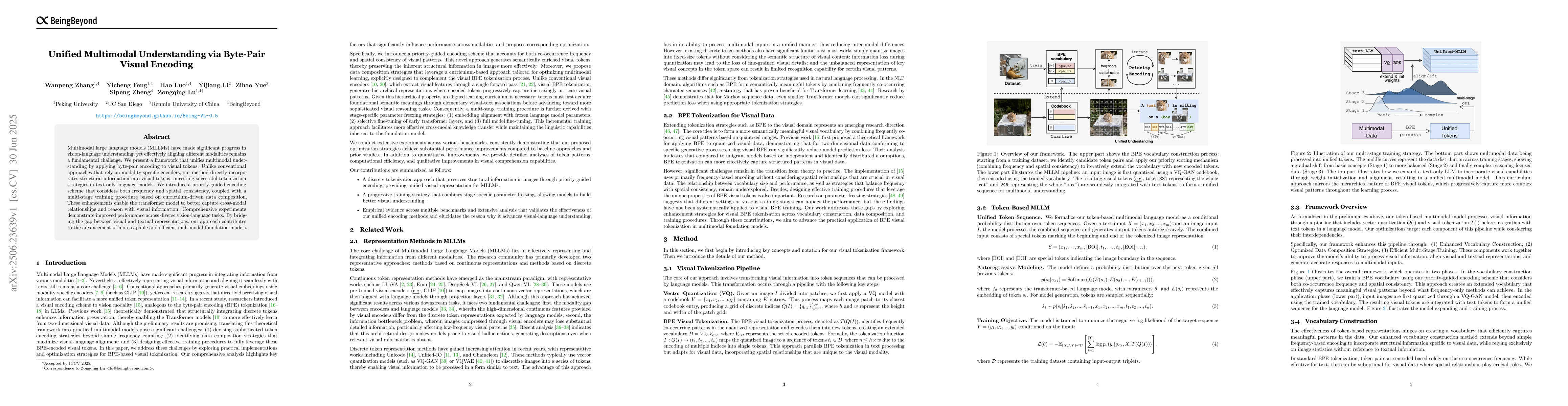 Multimodal large language models (MLLMs) have made significant progress in vision-language understanding, yet effectively aligning different modalities remains a fundamental challenge. We present a framework that unifies multimodal understanding by applying byte-pair encoding to visual tokens. Unlike conventional approaches that rely on modality-specific encoders, our method directly incorporates structural information into visual tokens, mirroring successful tokenization strategies in text-only language models. We introduce a priority-guided encoding scheme that considers both frequency and spatial consistency, coupled with a multi-stage training procedure based on curriculum-driven data composition. These enhancements enable the transformer model to better capture cross-modal relationships and reason with visual information. Comprehensive experiments demonstrate improved performance across diverse vision-language tasks. By bridging the gap between visual and textual representations, our approach contributes to the advancement of more capable and efficient multimodal foundation models.