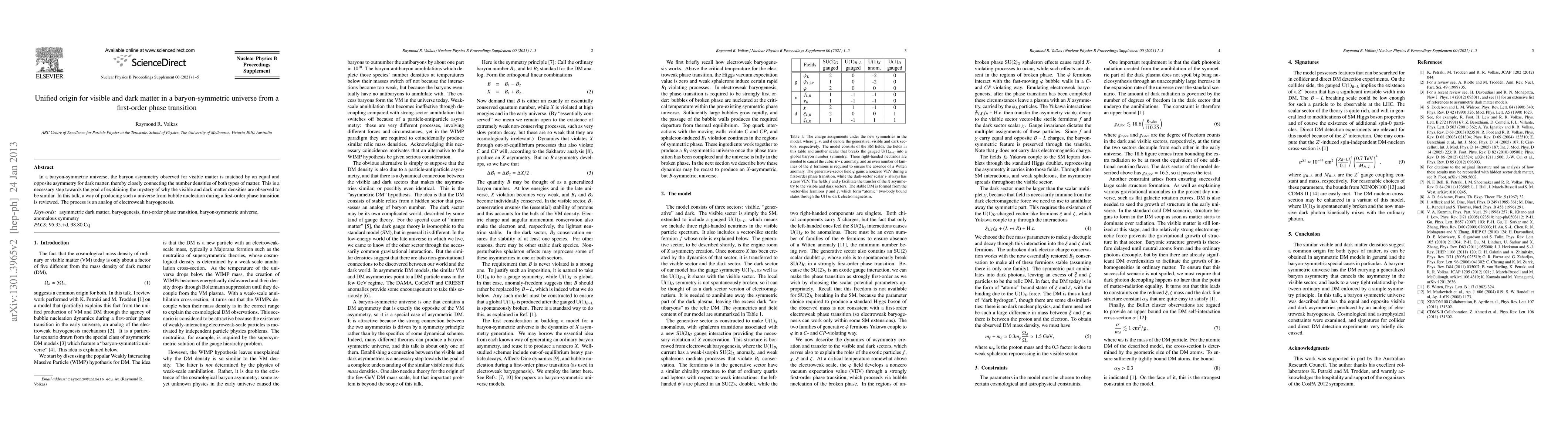 This paper proposes a unified origin for visible and dark matter in a baryon-symmetric universe, suggesting that both types of matter have equal but opposite asymmetries. The study explores a first-order phase transition during bubble nucleation as a mechanism to achieve this symmetry, analogous to electroweak baryogenesis.