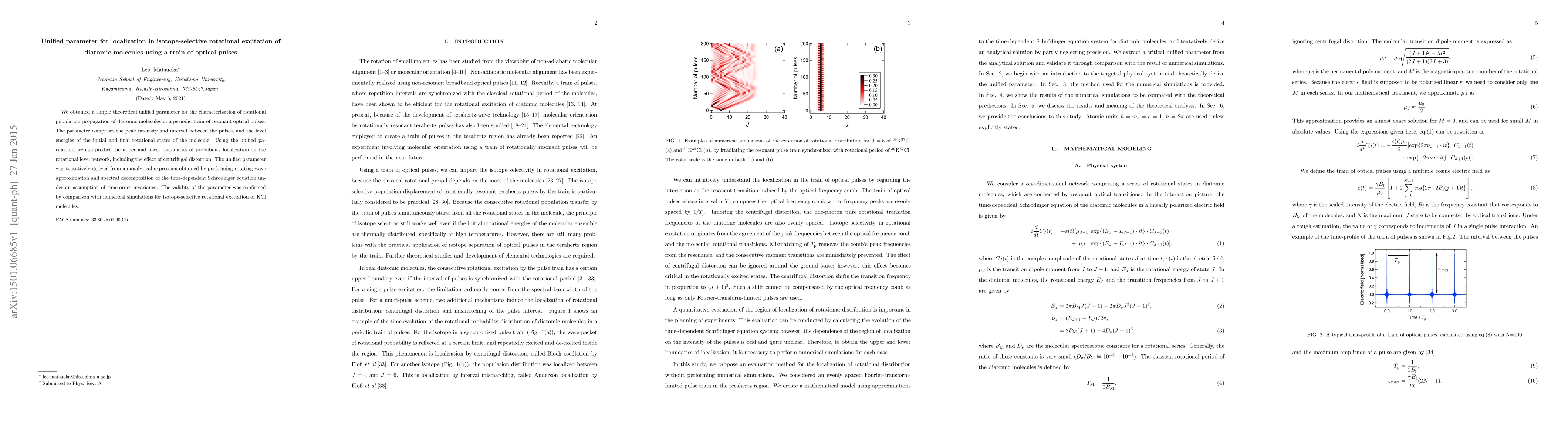 We obtained a simple theoretical unified parameter for the characterization of rotational population propagation of diatomic molecules in a periodic train of resonant optical pulses. The parameter comprises the peak intensity and interval between the pulses, and the level energies of the initial and final rotational states of the molecule. Using the unified parameter, we can predict the upper and lower boundaries of probability localization on the rotational level network, including the effect of centrifugal distortion. The unified parameter was tentatively derived from an analytical expression obtained by performing rotating-wave approximation and spectral decomposition of the time-dependent Schr\"{o}dinger equation under an assumption of time-order invariance. The validity of the parameter was confirmed by comparison with numerical simulations for isotope-selective rotational excitation of KCl molecules.