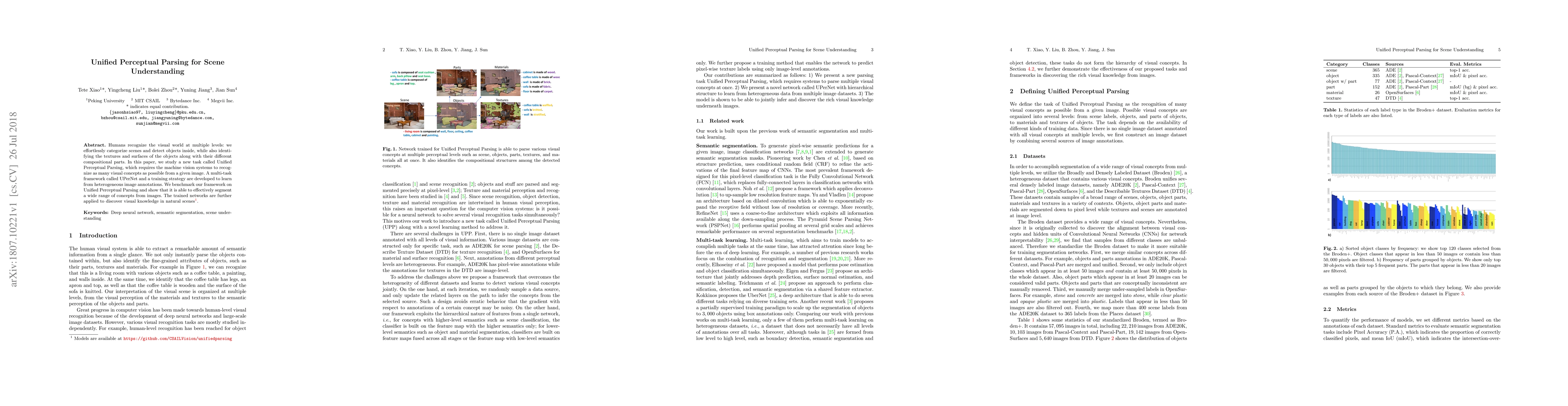 This paper introduces Unified Perceptual Parsing, a new task for machine vision systems to recognize diverse visual concepts in images. The proposed UPerNet framework and training strategy effectively segment a wide range of concepts, demonstrating the ability to discover visual knowledge in natural scenes.