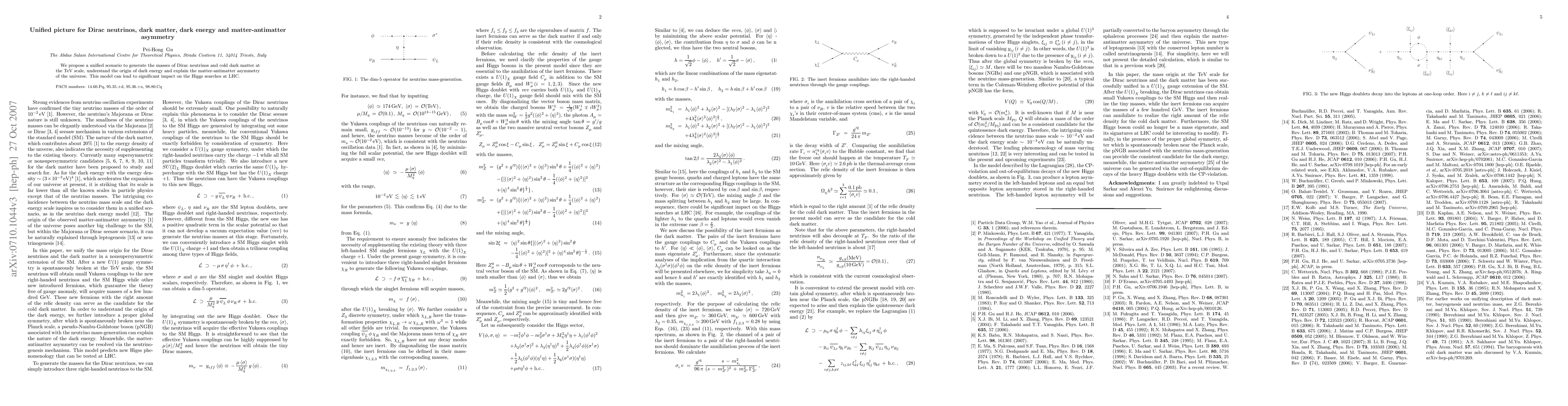 Summary: The paper proposes a unified framework to explain Dirac neutrino masses, cold dark matter, dark energy origins, and the matter-antimatter asymmetry, potentially influencing Higgs boson searches at the LHC. This model operates at the TeV scale.