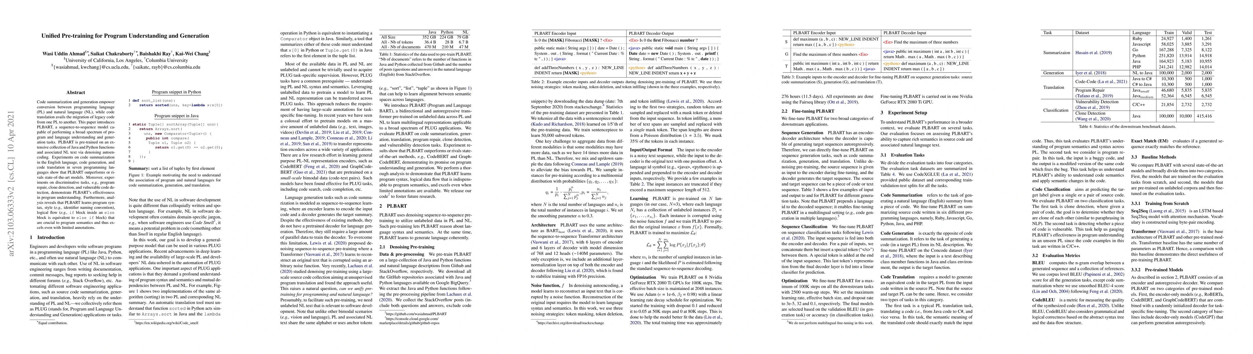 Code summarization and generation empower conversion between programming language (PL) and natural language (NL), while code translation avails the migration of legacy code from one PL to another. This paper introduces PLBART, a sequence-to-sequence model capable of performing a broad spectrum of program and language understanding and generation tasks. PLBART is pre-trained on an extensive collection of Java and Python functions and associated NL text via denoising autoencoding. Experiments on code summarization in the English language, code generation, and code translation in seven programming languages show that PLBART outperforms or rivals state-of-the-art models. Moreover, experiments on discriminative tasks, e.g., program repair, clone detection, and vulnerable code detection, demonstrate PLBART's effectiveness in program understanding. Furthermore, analysis reveals that PLBART learns program syntax, style (e.g., identifier naming convention), logical flow (e.g., if block inside an else block is equivalent to else if block) that are crucial to program semantics and thus excels even with limited annotations.