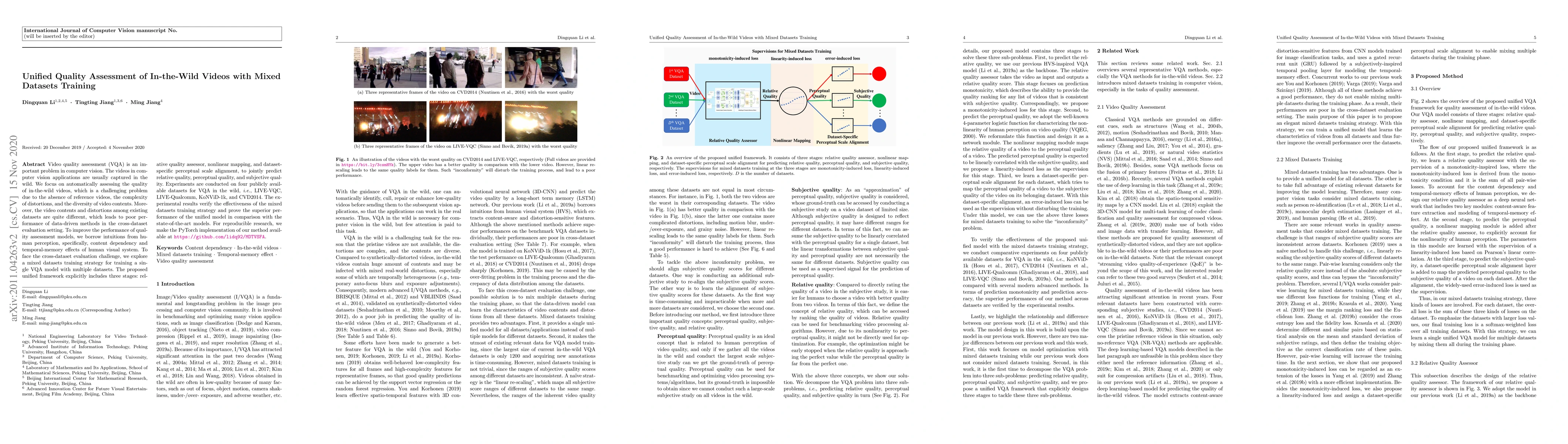This paper proposes a unified framework for assessing the quality of in-the-wild videos using a mixed datasets training strategy, addressing the challenge of diverse video contents and distortions across different datasets. The framework includes a relative quality assessor, nonlinear mapping, and dataset-specific perceptual scale alignment, achieving superior performance compared to state-of-the-art models.