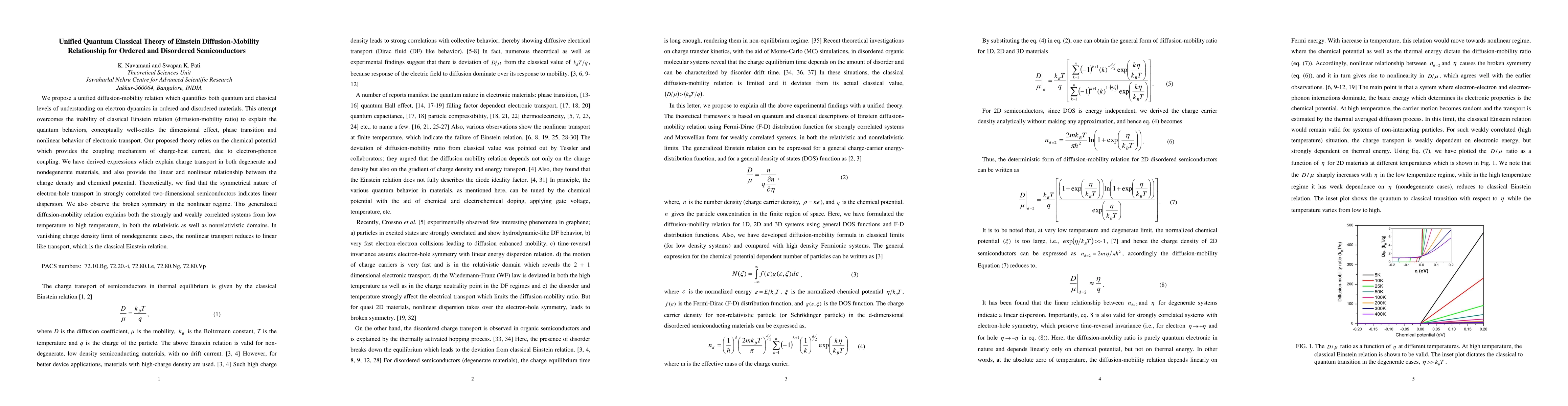 We propose a unified diffusion-mobility relation which quantifies both quantum and classical levels of understanding on electron dynamics in ordered and disordered materials. This attempt overcomes the inability of classical Einstein relation (diffusion-mobility ratio) to explain the quantum behaviors, conceptually well-settles the dimensional effect, phase transition and nonlinear behavior of electronic transport. Our proposed theory relies on the chemical potential which provides the coupling mechanism of charge-heat current, due to electron-phonon coupling. We have derived expressions which explain charge transport in both degenerate and nondegenerate materials, and also provide the linear and nonlinear relationship between the charge density and chemical potential. Theoretically, we find that the symmetrical nature of electron-hole transport in strongly correlated two-dimensional semiconductors indicates linear dispersion. We also observe the broken symmetry in the nonlinear regime. This generalized diffusion-mobility relation explains both the strongly and weakly correlated systems from low temperature to high temperature, in both the relativistic as well as nonrelativistic domains. In vanishing charge density limit of nondegenerate cases, the nonlinear transport reduces to linear like transport, which is the classical Einstein relation.