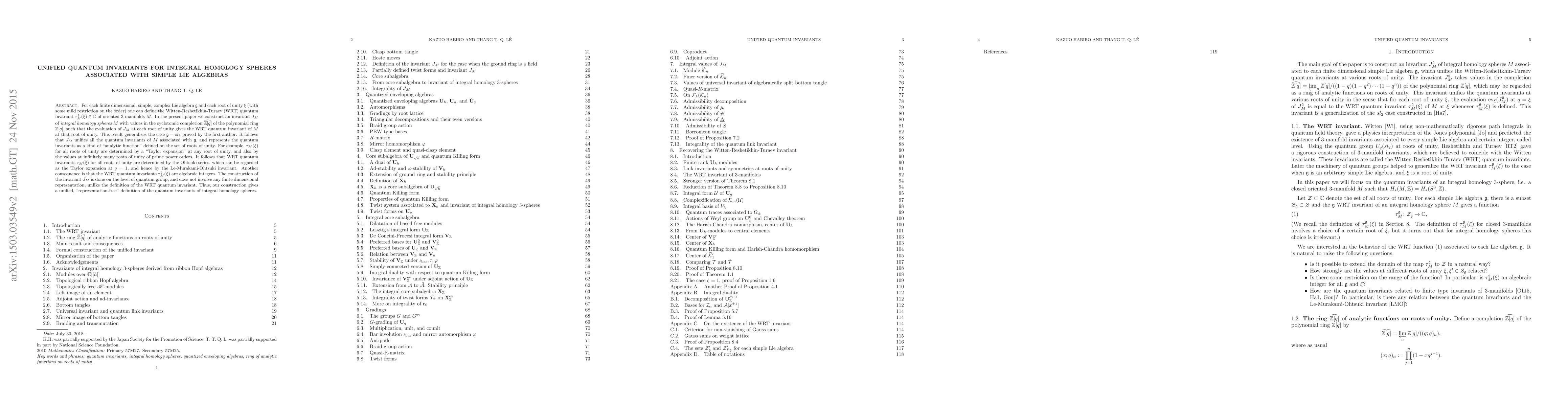 This paper constructs a unified quantum invariant $J_M$ for integral homology spheres associated with simple Lie algebras, unifying WRT quantum invariants and providing a 'representation-free' definition.
