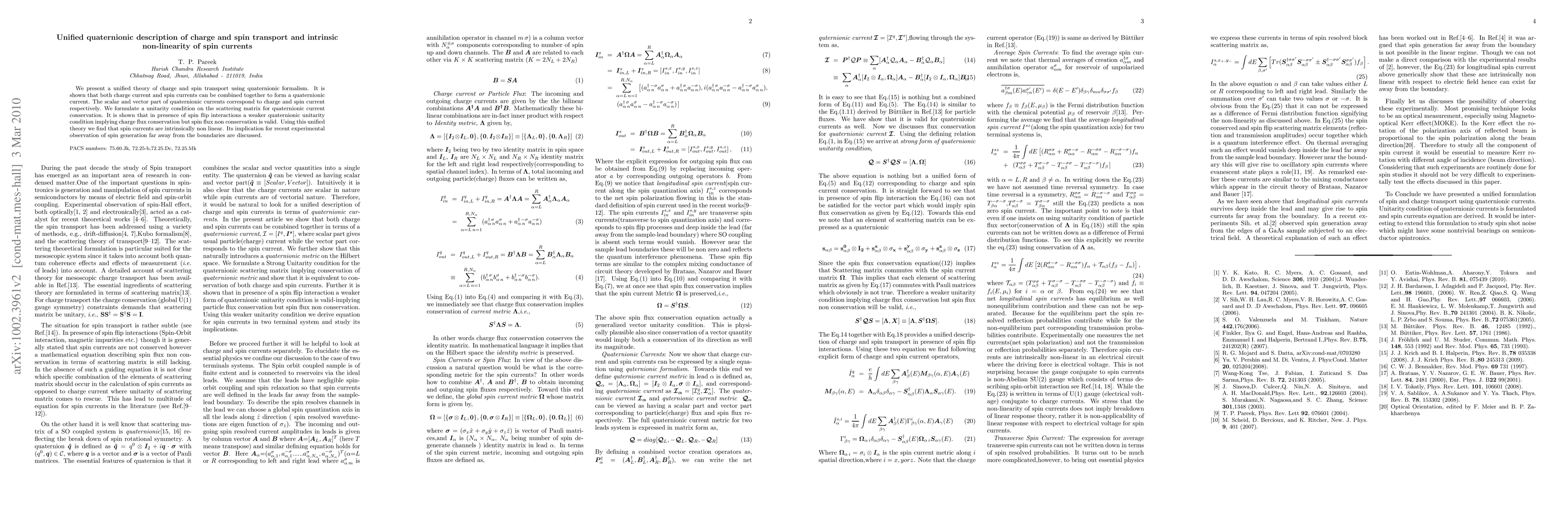 This paper proposes a unified quaternionic framework for charge and spin transport, demonstrating that both can be represented as a quaternionic current. It reveals intrinsic non-linearity in spin currents and discusses implications for experimental observations of spin generation.