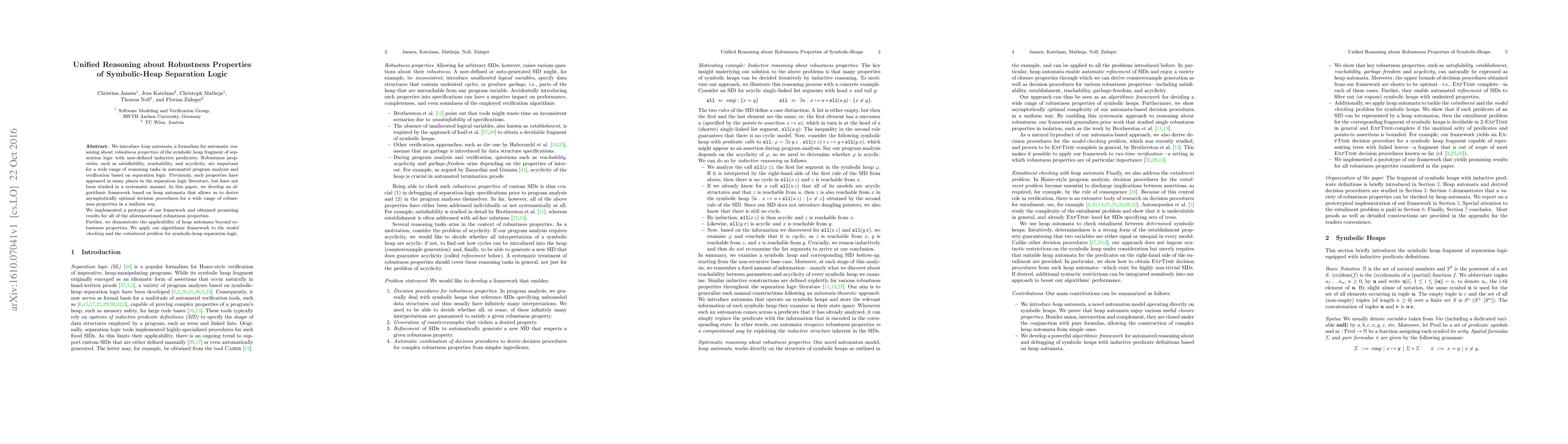 This paper introduces heap automata for systematically reasoning about robustness properties in symbolic-heap separation logic, presenting an algorithmic framework to derive optimal decision procedures. The authors implemented a prototype showing promising results and demonstrated the framework's applicability to model checking and entailment problems.