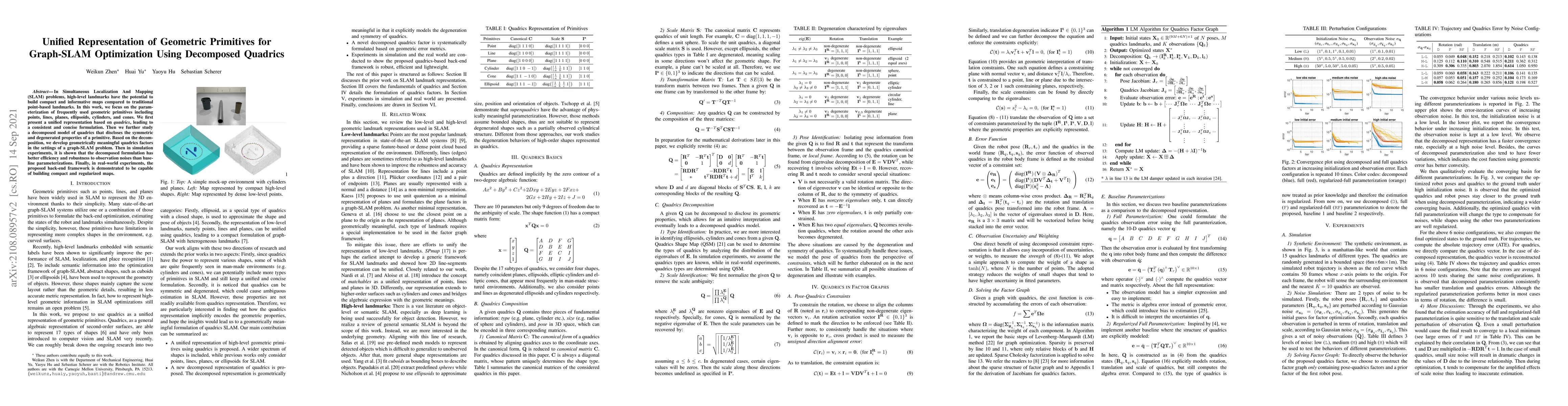 This paper proposes a unified representation of geometric primitives using decomposed quadrics for graph-SLAM optimization. The decomposed quadrics reveal symmetric and degenerated properties, leading to more efficient and robust mapping compared to traditional methods.
