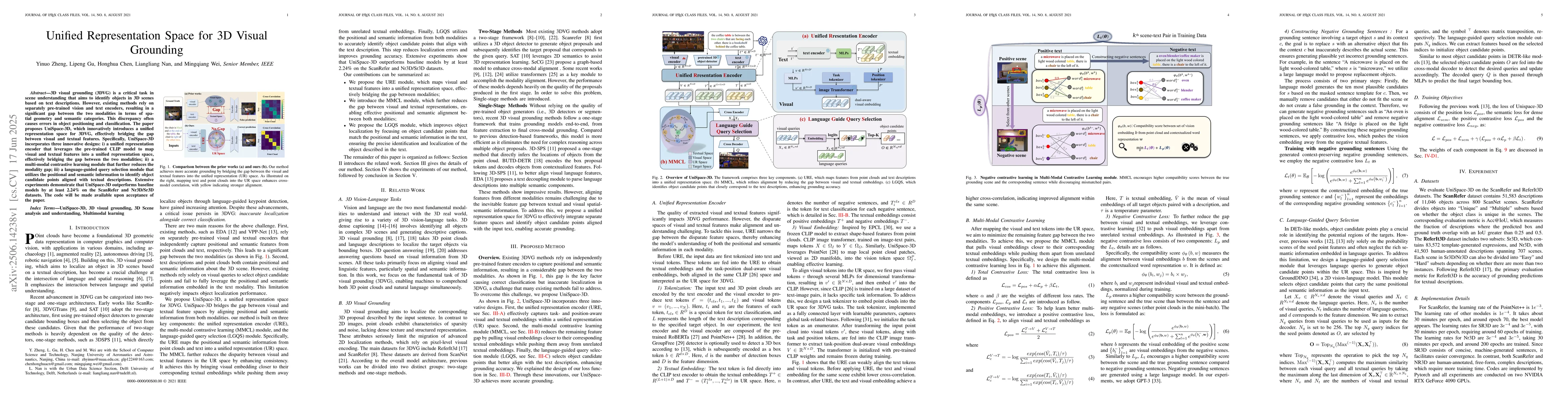 The paper introduces UniSpace-3D, a unified representation space for 3D visual grounding, which leverages a pre-trained CLIP model to map visual and textual features into a unified space, bridging the gap between modalities. It incorporates a unified representation encoder, a multi-modal contrastive learning module, and a language-guided query selection module.
