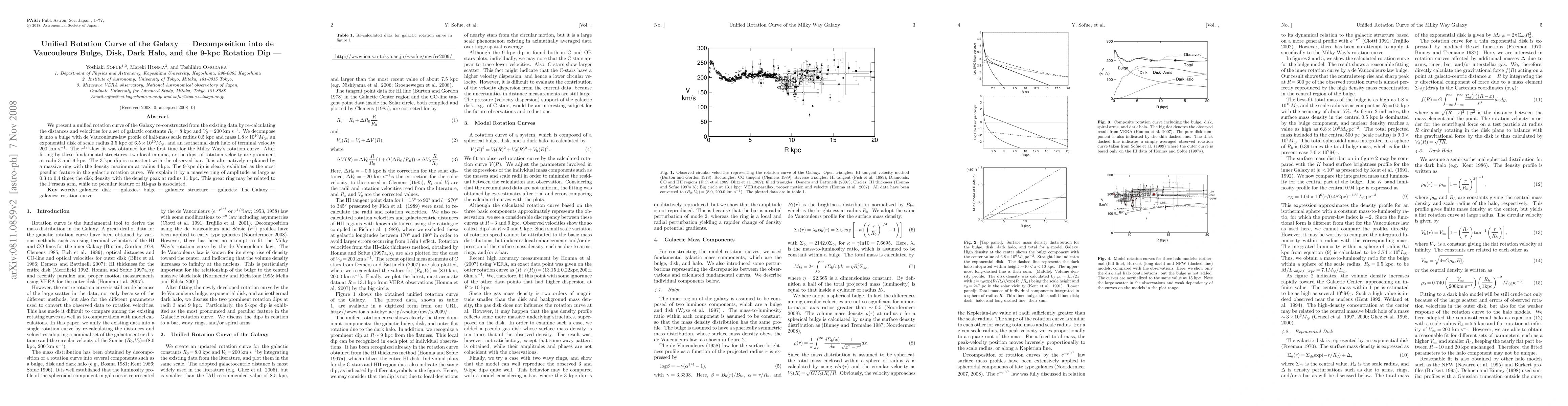 We present a unified rotation curve of the Galaxy re-constructed from the existing data by re-calculating the distances and velocities for a set of galactic constants R_0=8 kpc and V_0=200 km/s. We decompose it into a bulge with de Vaucouleurs-law profile of half-mass scale radius 0.5 kpc and mass 1.8 x 10^{10}M_{sun}, an exponential disk of scale radius 3.5 kpc of 6.5 x 10^{10}M_{sun}, and an isothermal dark halo of terminal velocity 200 km/s. The r^{1/4}-law fit was obtained for the first time for the Milky Way's rotation curve. After fitting by these fundamental structures, two local minima, or the dips, of rotation velocity are prominent at radii 3 and 9 kpc. The 3-kpc dip is consistent with the observed bar. It is alternatively explained by a massive ring with the density maximum at radius 4 kpc. The 9-kpc dip is clearly exhibited as the most peculiar feature in the galactic rotation curve. We explain it by a massive ring of amplitude as large as 0.3 to 0.4 times the disk density with the density peak at radius 11 kpc. This great ring may be related to the Perseus arm, while no peculiar feature of HI-gas is associated.