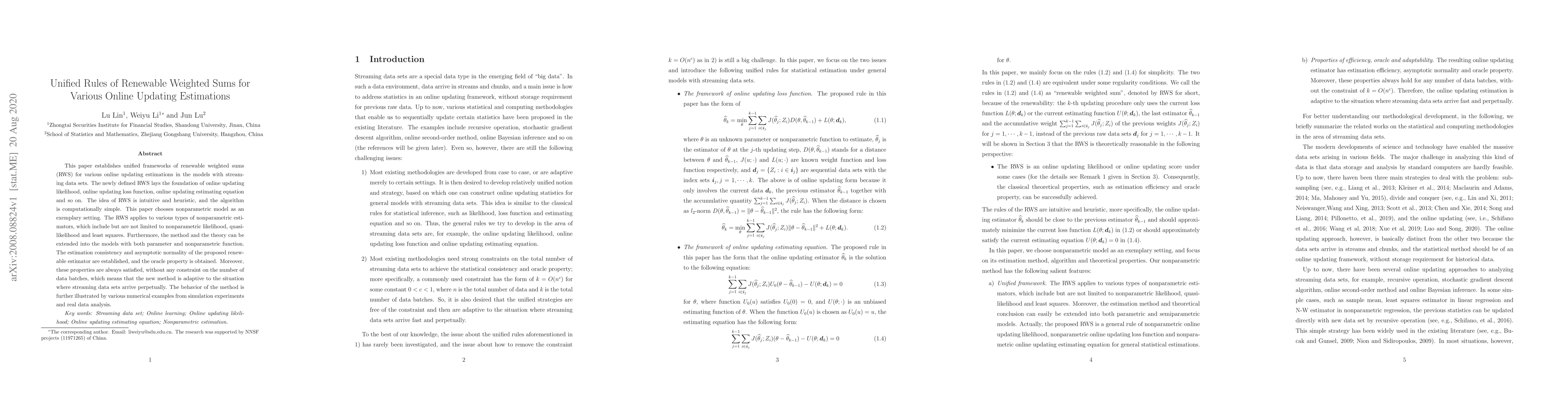 This paper establishes unified frameworks of renewable weighted sums (RWS) for various online updating estimations in the models with streaming data sets. The newly defined RWS lays the foundation of online updating likelihood, online updating loss function, online updating estimating equation and so on. The idea of RWS is intuitive and heuristic, and the algorithm is computationally simple. This paper chooses nonparametric model as an exemplary setting. The RWS applies to various types of nonparametric estimators, which include but are not limited to nonparametric likelihood, quasi-likelihood and least squares. Furthermore, the method and the theory can be extended into the models with both parameter and nonparametric function. The estimation consistency and asymptotic normality of the proposed renewable estimator are established, and the oracle property is obtained. Moreover, these properties are always satisfied, without any constraint on the number of data batches, which means that the new method is adaptive to the situation where streaming data sets arrive perpetually. The behavior of the method is further illustrated by various numerical examples from simulation experiments and real data analysis.