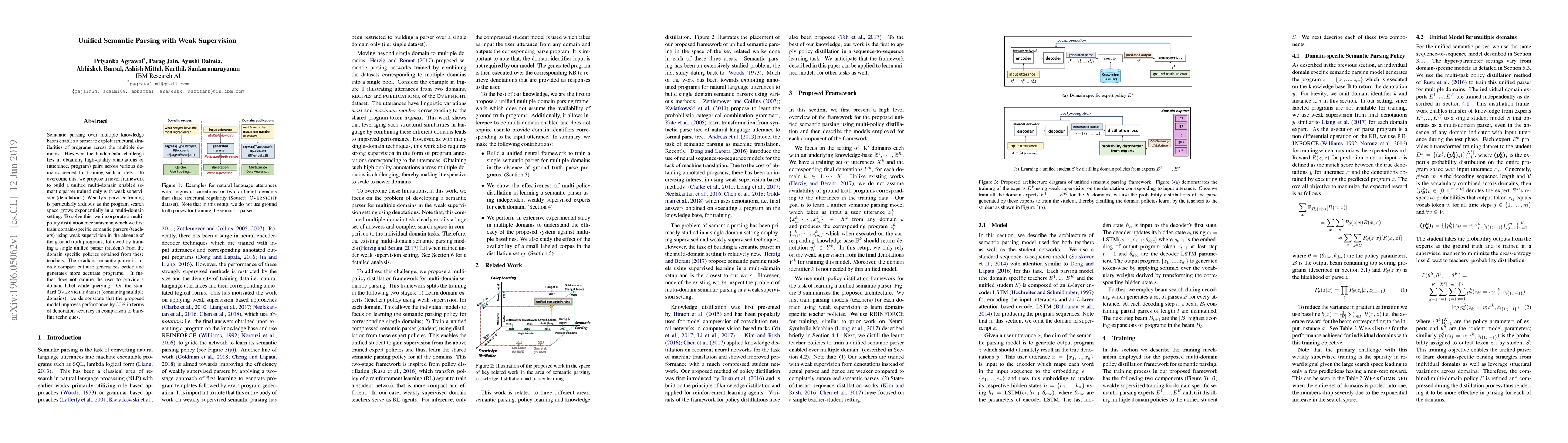 This paper proposes a framework for a unified multi-domain semantic parser trained with weak supervision, leveraging a multi-policy distillation mechanism to improve denotation accuracy by 20% over baselines on the Overnight dataset. The approach trains domain-specific parsers first and then a unified parser from their policies, achieving better generalization without requiring domain labels.