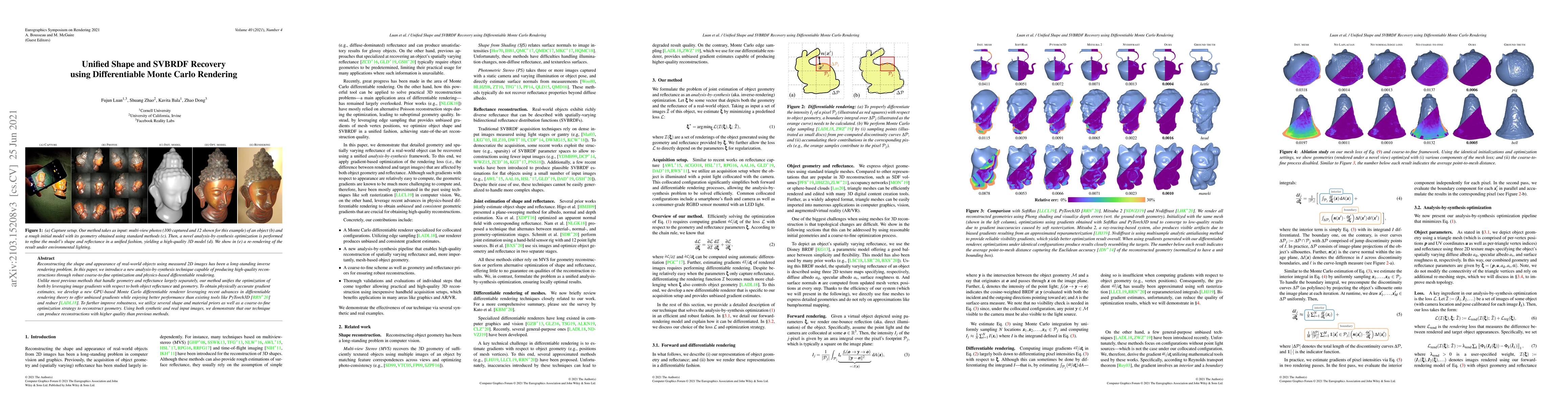 This paper presents a novel analysis-by-synthesis technique for reconstructing real-world objects' shape and appearance using 2D images, integrating shape and SVBRDF recovery through a unified optimization approach and differentiable Monte Carlo rendering for accurate gradient estimates. The method outperforms existing techniques like COLMAP and Kinect Fusion in reconstruction quality.