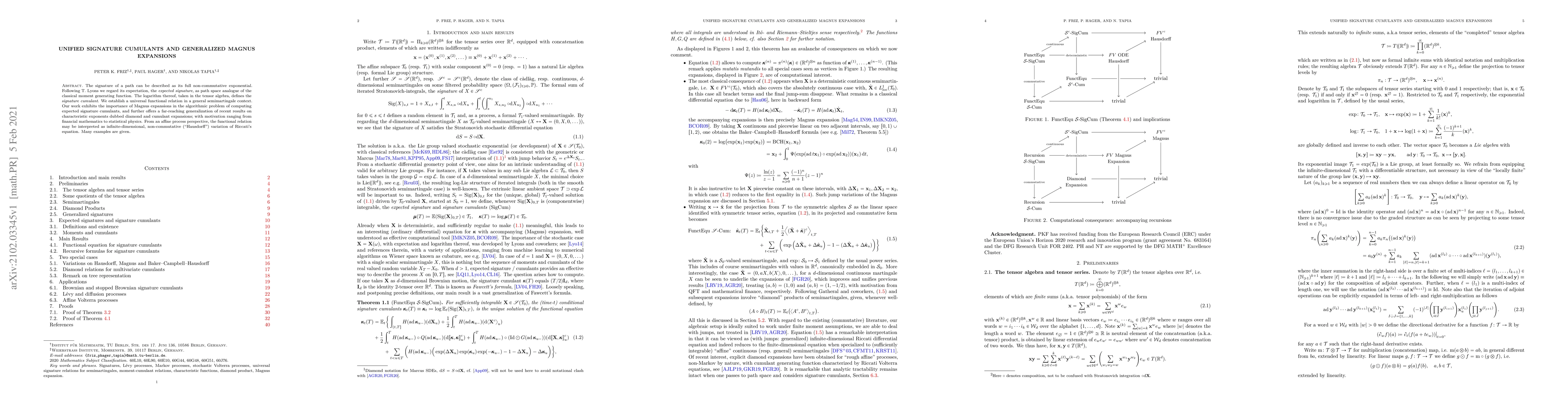The signature of a path can be described as its full non-commutative exponential. Following T. Lyons we regard its expectation, the expected signature, as path space analogue of the classical moment generating function. The logarithm thereof, taken in the tensor algebra, defines the signature cumulant. We establish a universal functional relation in a general semimartingale context. Our work exhibits the importance of Magnus expansions in the algorithmic problem of computing expected signature cumulants, and further offers a far-reaching generalization of recent results on characteristic exponents dubbed diamond and cumulant expansions; with motivation ranging from financial mathematics to statistical physics. From an affine process perspective, the functional relation may be interpreted as infinite-dimensional, non-commutative ("Hausdorff") variation of Riccati's equation. Many examples are given.