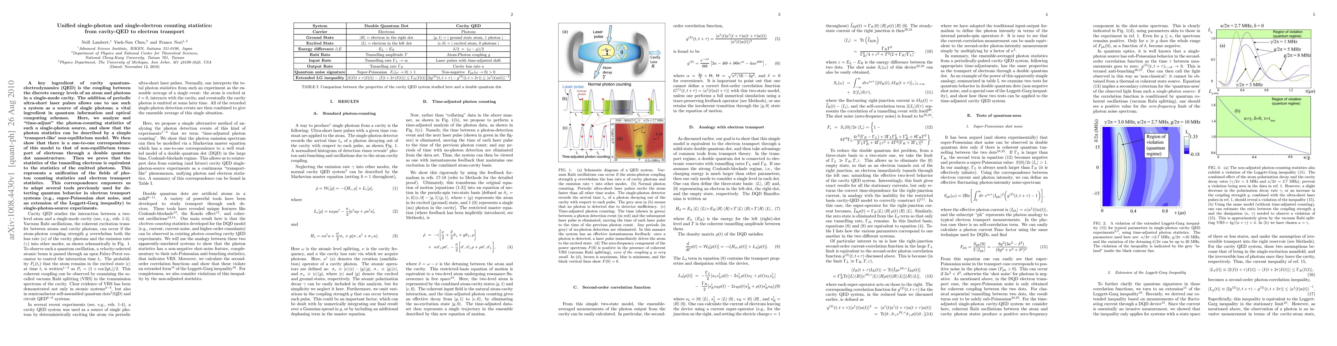 This paper establishes a unified framework for single-photon and single-electron counting statistics, demonstrating that photon-counting statistics from cavity-QED can be modeled using a transport-like non-equilibrium model, which parallels the electron transport statistics in double quantum dot nanostructures. This correspondence enables the application of electron transport analysis tools to single-photon source experiments.