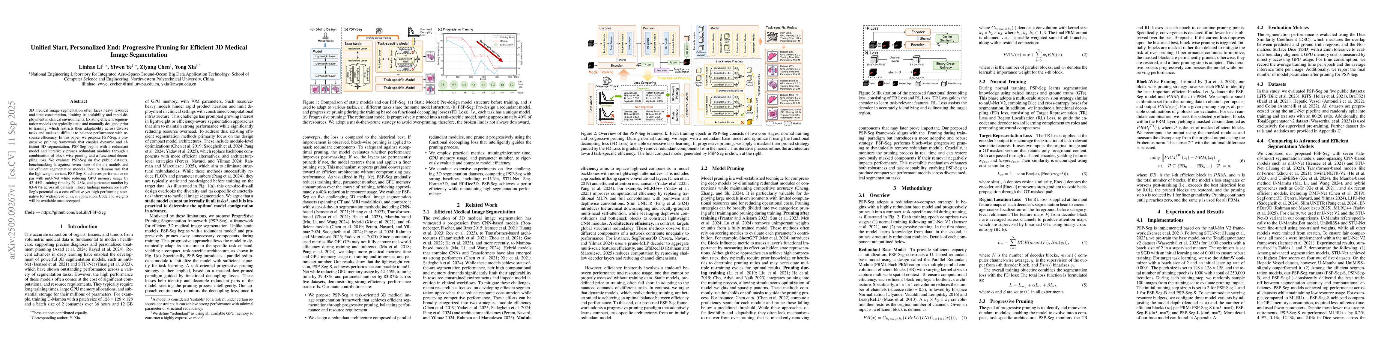 3D medical image segmentation often faces heavy resource and time consumption, limiting its scalability and rapid deployment in clinical environments. Existing efficient segmentation models are typically static and manually designed prior to training, which restricts their adaptability across diverse tasks and makes it difficult to balance performance with resource efficiency. In this paper, we propose PSP-Seg, a progressive pruning framework that enables dynamic and efficient 3D segmentation. PSP-Seg begins with a redundant model and iteratively prunes redundant modules through a combination of block-wise pruning and a functional decoupling loss. We evaluate PSP-Seg on five public datasets, benchmarking it against seven state-of-the-art models and six efficient segmentation models. Results demonstrate that the lightweight variant, PSP-Seg-S, achieves performance on par with nnU-Net while reducing GPU memory usage by 42-45%, training time by 29-48%, and parameter number by 83-87% across all datasets. These findings underscore PSP-Seg's potential as a cost-effective yet high-performing alternative for widespread clinical application.