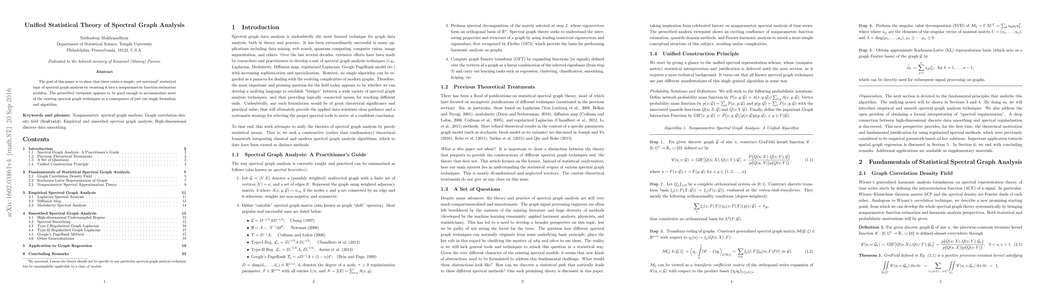 The goal of this paper is to show that there exists a simple, yet universal statistical logic of spectral graph analysis by recasting it into a nonparametric function estimation problem. The prescribed viewpoint appears to be good enough to accommodate most of the existing spectral graph techniques as a consequence of just one single formalism and algorithm.