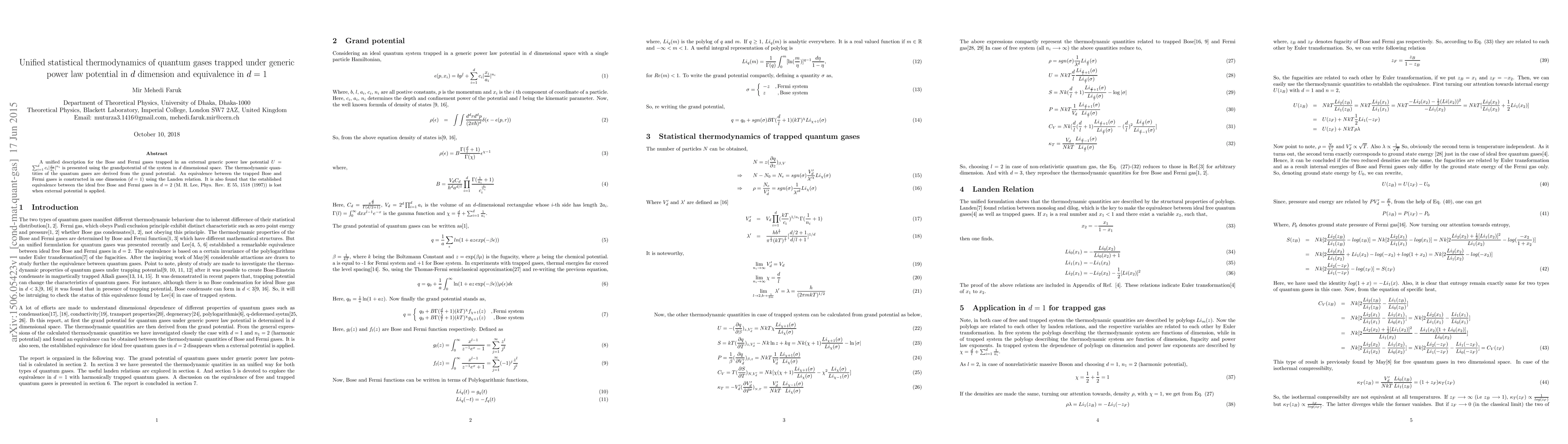 This paper provides a unified statistical thermodynamics framework for Bose and Fermi gases under generic power law potentials in $d$ dimensions, deriving thermodynamic quantities from the grand potential. It establishes an equivalence between trapped Bose and Fermi gases in one dimension using the Landen relation.