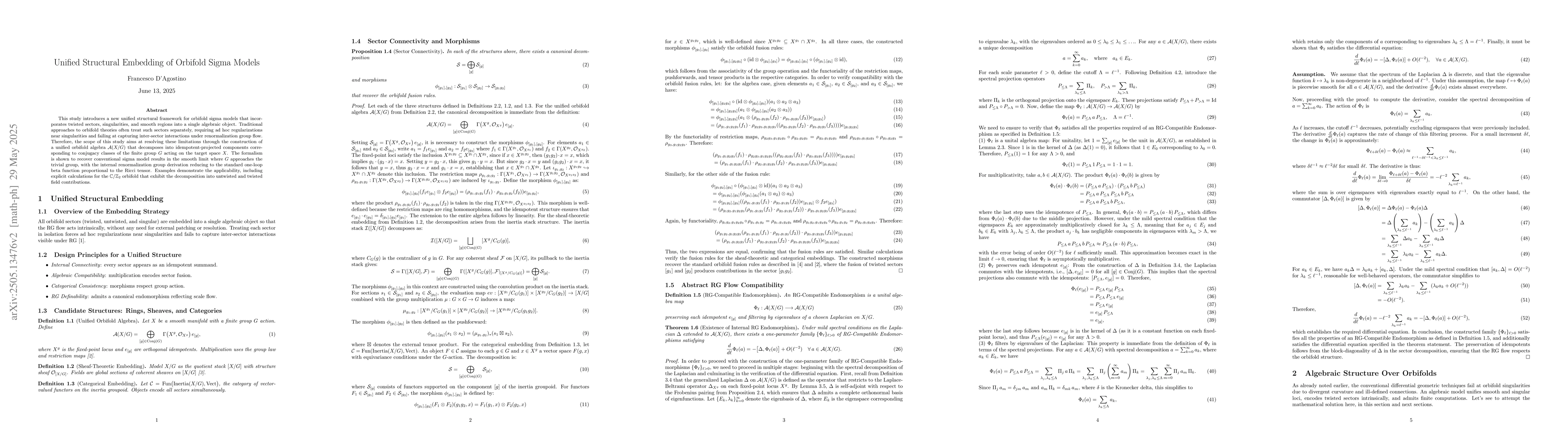 This study introduces a new unified structural framework for orbifold sigma models that incorporates twisted sectors, singularities, and smooth regions into a single algebraic object. Traditional approaches to orbifold theories often treat such sectors separately, requiring ad hoc regularizations near singularities and failing at capturing inter-sector interactions under renormalization group flow. Therefore, the scope of this study aims at resolving these limitations through the construction of a unified orbifold algebra $\mathcal{A}(X/G)$ that decomposes into idempotent-projected components corresponding to conjugacy classes of the finite group $G$ acting on the target space $X$. The formalism is shown to recover conventional sigma model results in the smooth limit where $G$ approaches the trivial group, with the internal renormalization group derivation reducing to the standard one-loop beta function proportional to the Ricci tensor. Examples demonstrate the applicability, including explicit calculations for the $\mathbb{C}/\mathbb{Z}_2$ orbifold that exhibit the decomposition into untwisted and twisted field contributions.