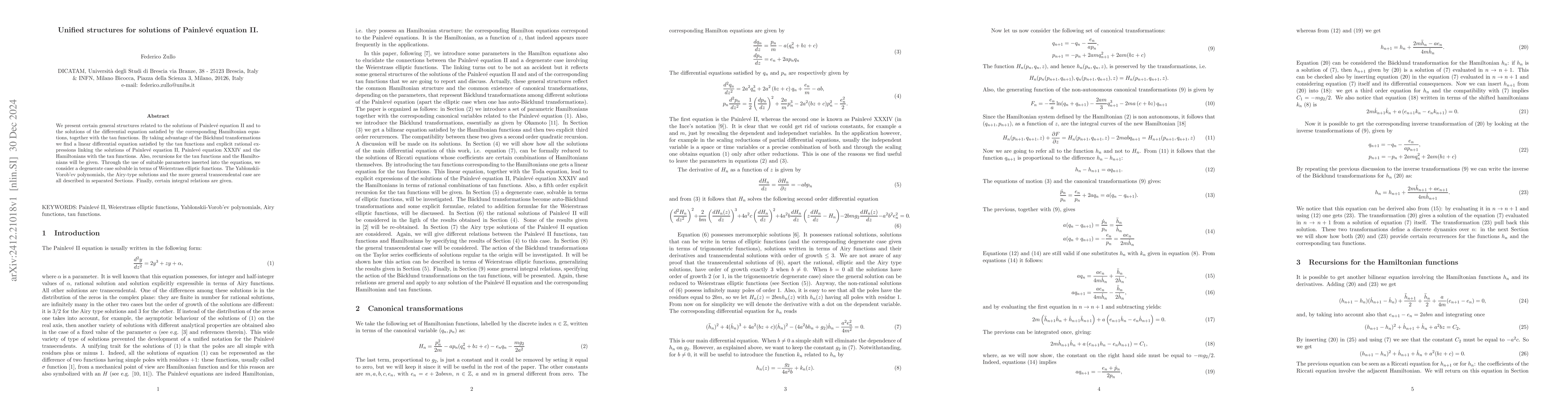 This paper explores general structures and relationships among solutions of Painlevé equation II, associated Hamiltonian equations, and tau functions. It utilizes Bäcklund transformations to derive a linear differential equation for tau functions and explicit links between solutions of Painlevé equations II and XXXIV, along with Hamiltonians. It also discusses degenerate cases solvable in terms of Weierstrass elliptic functions and presents integral relations.