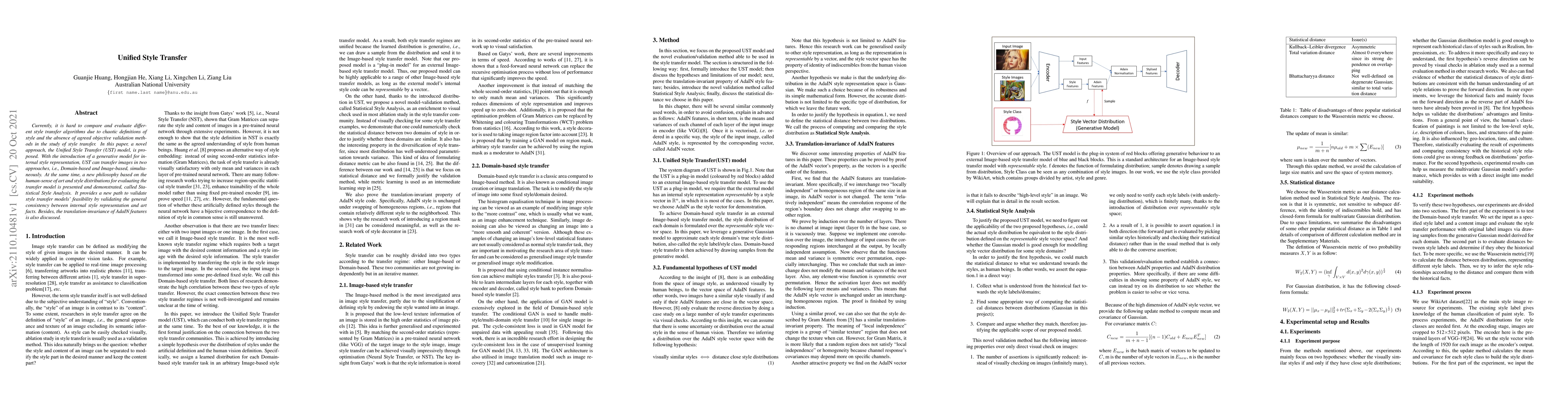 Currently, it is hard to compare and evaluate different style transfer algorithms due to chaotic definitions of style and the absence of agreed objective validation methods in the study of style transfer. In this paper, a novel approach, the Unified Style Transfer (UST) model, is proposed. With the introduction of a generative model for internal style representation, UST can transfer images in two approaches, i.e., Domain-based and Image-based, simultaneously. At the same time, a new philosophy based on the human sense of art and style distributions for evaluating the transfer model is presented and demonstrated, called Statistical Style Analysis. It provides a new path to validate style transfer models' feasibility by validating the general consistency between internal style representation and art facts. Besides, the translation-invariance of AdaIN features is also discussed.