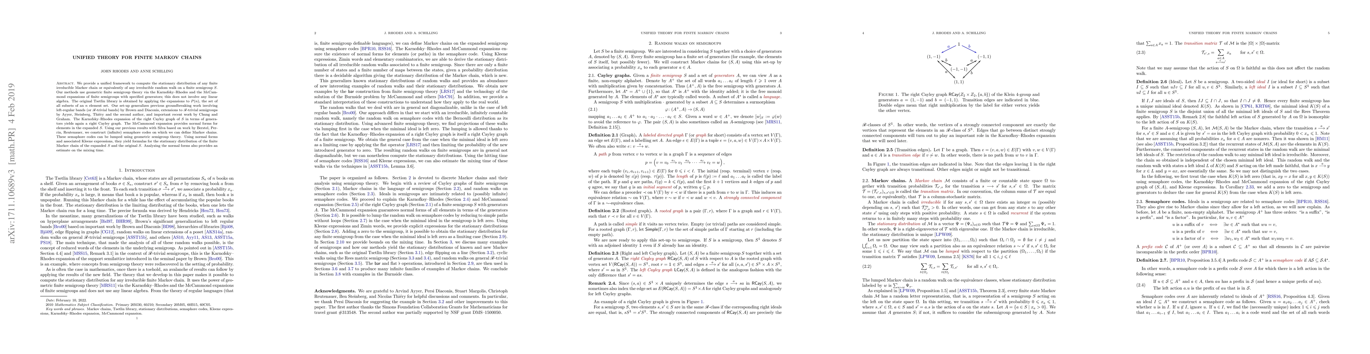 We provide a unified framework to compute the stationary distribution of any finite irreducible Markov chain or equivalently of any irreducible random walk on a finite semigroup $S$. Our methods use geometric finite semigroup theory via the Karnofsky-Rhodes and the McCammond expansions of finite semigroups with specified generators; this does not involve any linear algebra. The original Tsetlin library is obtained by applying the expansions to $P(n)$, the set of all subsets of an $n$ element set. Our set-up generalizes previous groundbreaking work involving left-regular bands (or $\mathscr{R}$-trivial bands) by Brown and Diaconis, extensions to $\mathscr{R}$-trivial semigroups by Ayyer, Steinberg, Thi\'ery and the second author, and important recent work by Chung and Graham. The Karnofsky-Rhodes expansion of the right Cayley graph of $S$ in terms of generators yields again a right Cayley graph. The McCammond expansion provides normal forms for elements in the expanded $S$. Using our previous results with Silva based on work by Berstel, Perrin, Reutenauer, we construct (infinite) semaphore codes on which we can define Markov chains. These semaphore codes can be lumped using geometric semigroup theory. Using normal forms and associated Kleene expressions, they yield formulas for the stationary distribution of the finite Markov chain of the expanded $S$ and the original $S$. Analyzing the normal forms also provides an estimate on the mixing time.