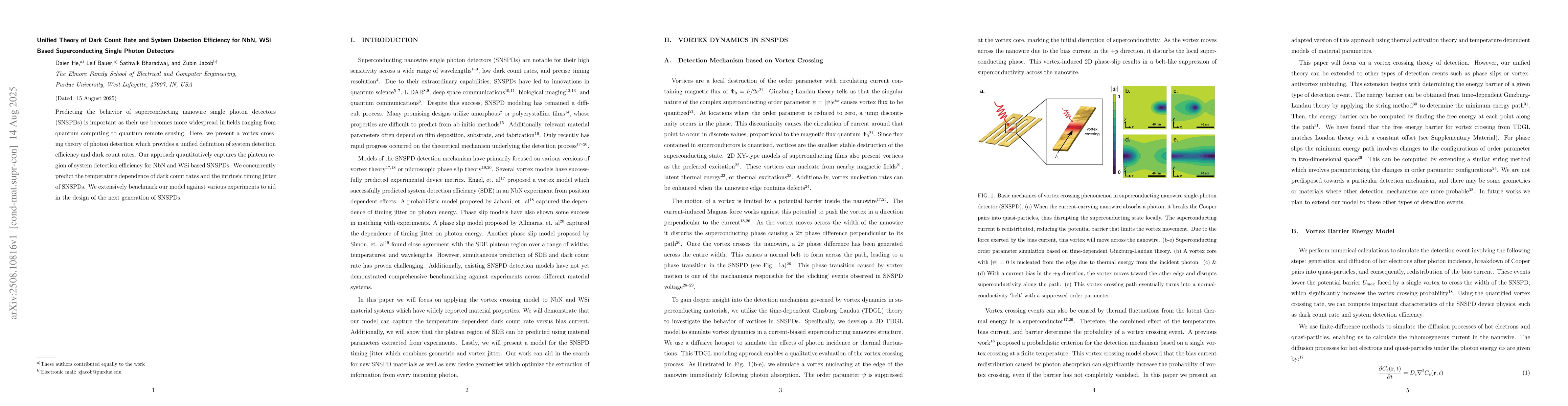 Predicting the behavior of superconducting nanowire single photon detectors (SNSPDs) is important as their use becomes more widespread in fields ranging from quantum computing to quantum remote sensing. Here, we present a vortex crossing theory of photon detection which provides a unified definition of system detection efficiency and dark count rates. Our approach quantitatively captures the plateau region of system detection efficiency for NbN and WSi based SNSPDs. We concurrently predict the temperature dependence of dark count rates and the intrinsic timing jitter of SNSPDs. We extensively benchmark our model against various experiments to aid in the design of the next generation of SNSPDs.