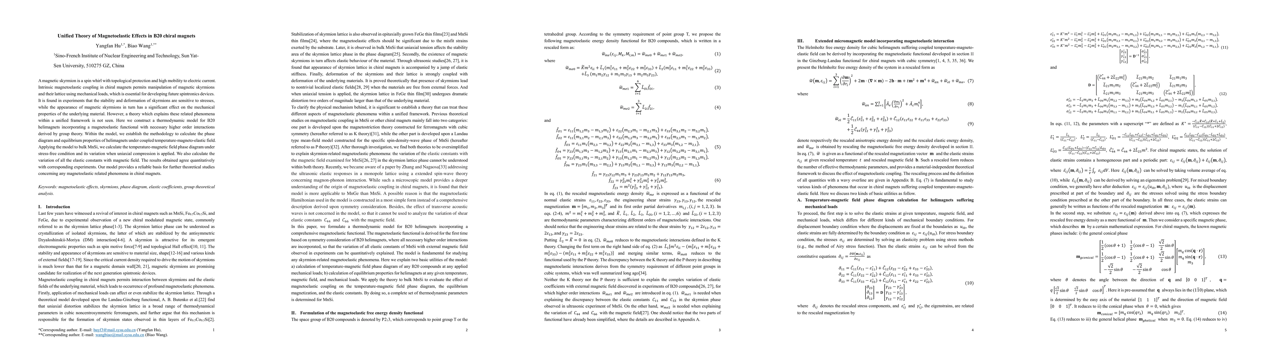 This paper presents a thermodynamic model for B20 helimagnets that unifies magnetoelastic coupling, explaining how mechanical stress affects the stability and deformation of magnetic skyrmions and vice versa. The model accurately predicts the phase diagram and elastic constants' variation under magnetic fields and stresses, aligning well with experimental data for bulk MnSi.